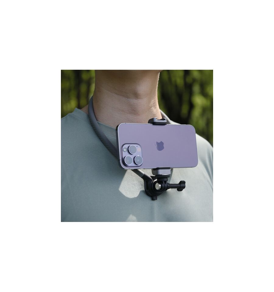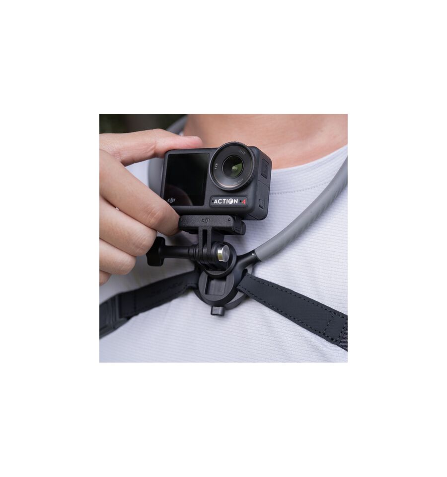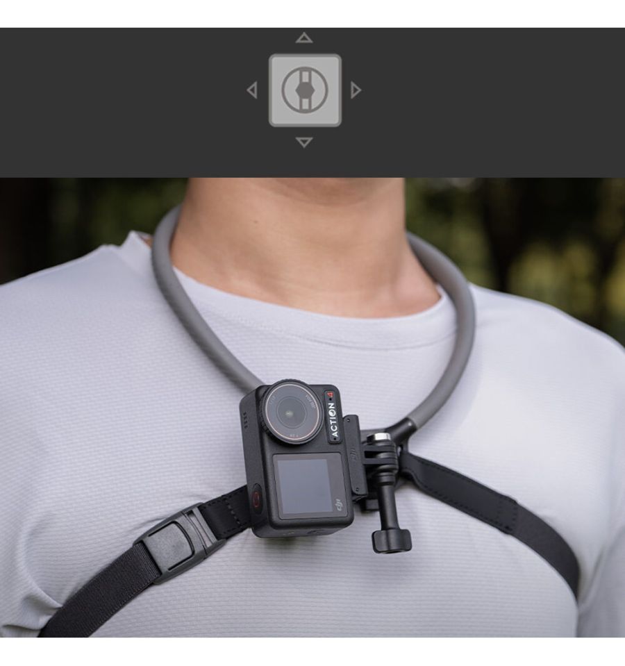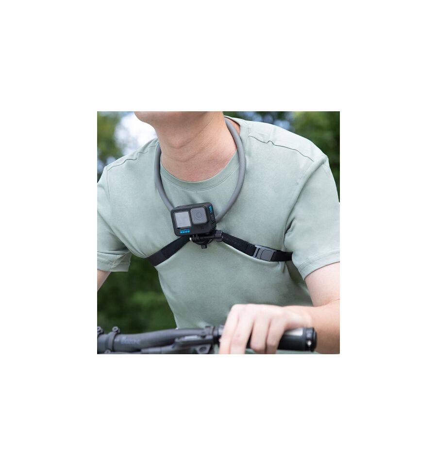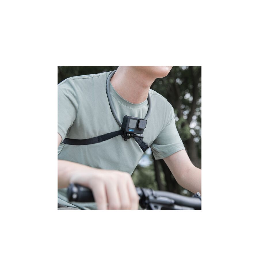 Este soporte permite llevar la cámara de acción de manera cómoda y segura alrededor del cuello, facilitando el acceso rápido para grabar. Su diseño ergonómico y ajustable asegura que se mantenga firme durante el uso prolongado.