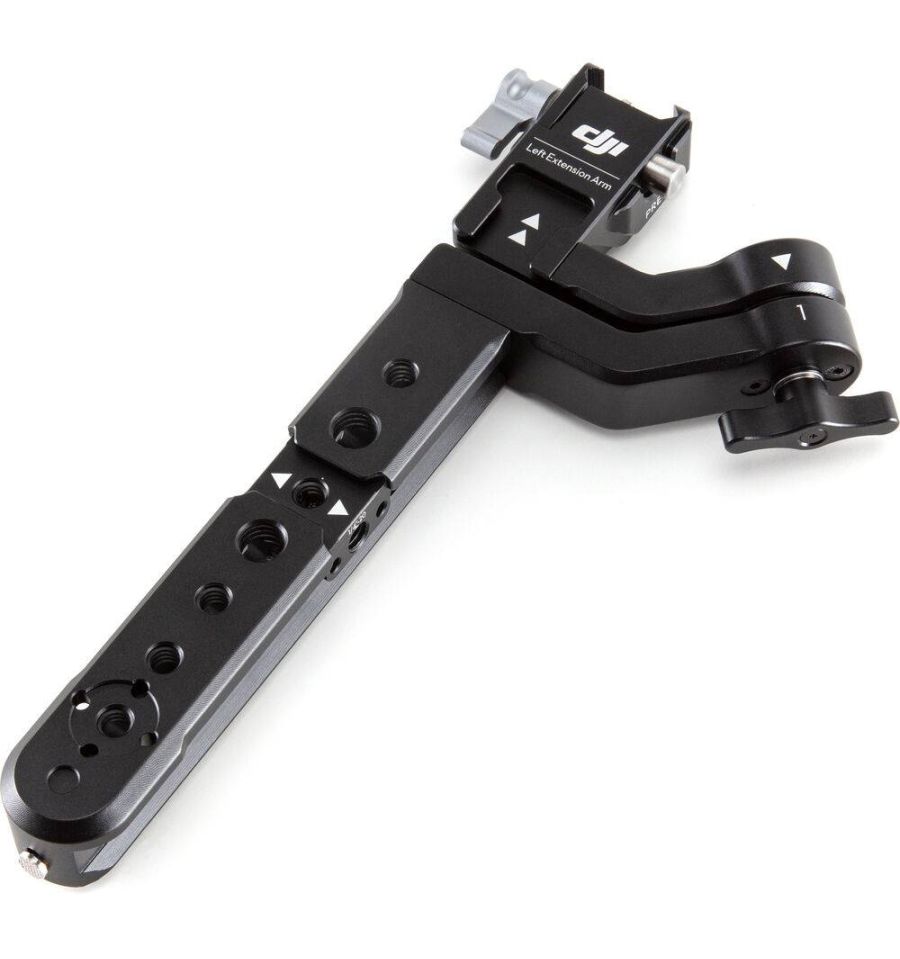 Además, el brazo de extensión izquierdo también se puede usar solo para sostener el cardán suspendido, en modo "maletín", para tomas de ángulo bajo. En tal configuración, una de las manijas de agarre se uniría al brazo. Los brazos de extensión también ofrecen orificios roscados de 1/4"-20 y 3/8"16 y zapatas para accesorios.