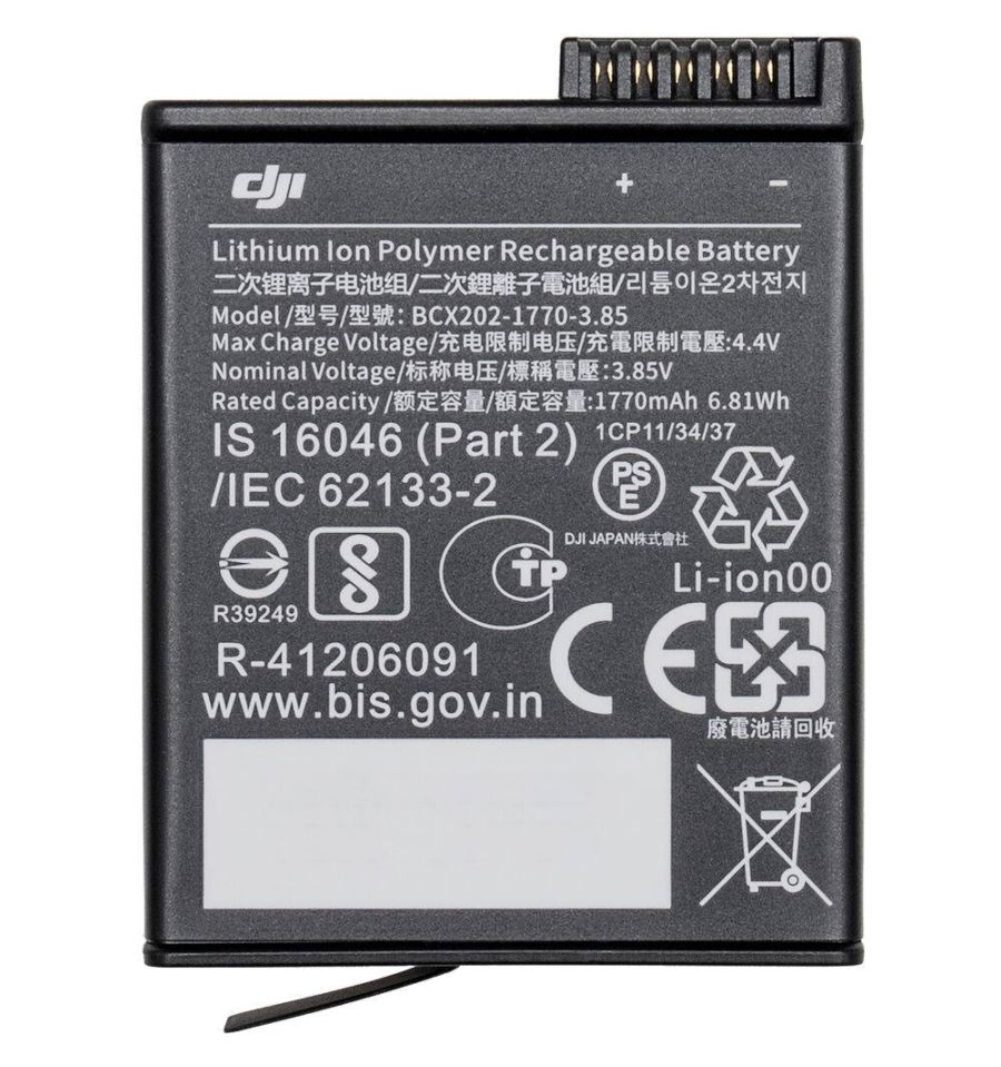Diseñada específicamente para la cámara Osmo Action 3, esta batería extrema de polímero de iones de litio de DJI tiene una capacidad de 1770 mAh/6,81 Wh y una potencia de salida de 3,85 V. La batería le permite grabar hasta 160 minutos de video con Osmo Action 3. Se puede cargar dentro de la cámara o usando un cargador rápido estándar o PD opcional.