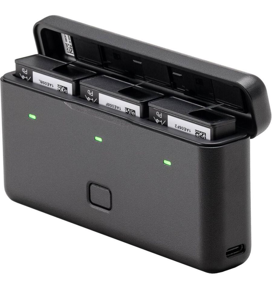 Almacene y cargue hasta tres baterías para su cámara Osmo Action 3 con este estuche de batería multifuncional de DJI . El estuche almacena tres baterías Osmo 3 y también puede cargarlas rápidamente simultáneamente. El estuche puede ser alimentado por una fuente de alimentación externa a través de su puerto USB tipo C y también puede actuar como un banco de energía para alimentar otros dispositivos a través de ese mismo puerto. El estuche incluso almacena dos tarjetas microSD para mantenerlas seguras y protegidas.