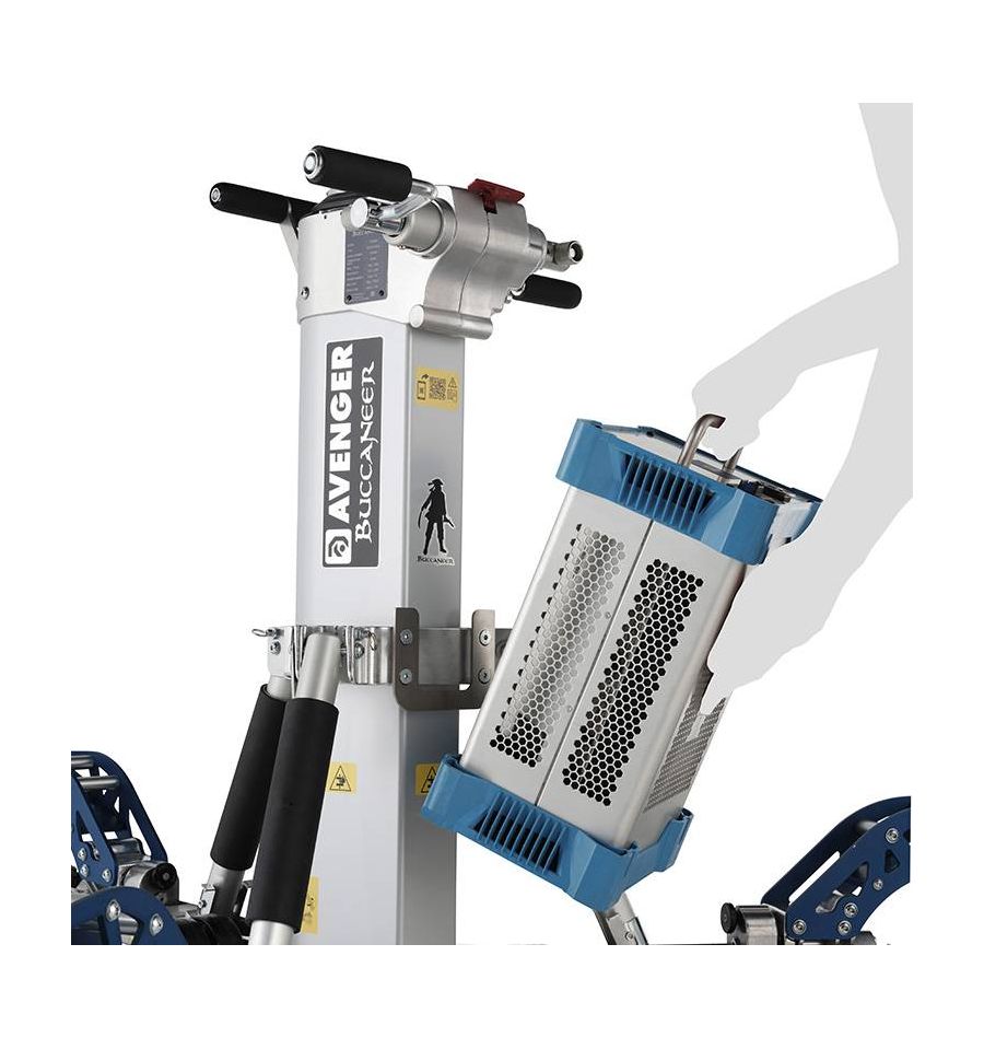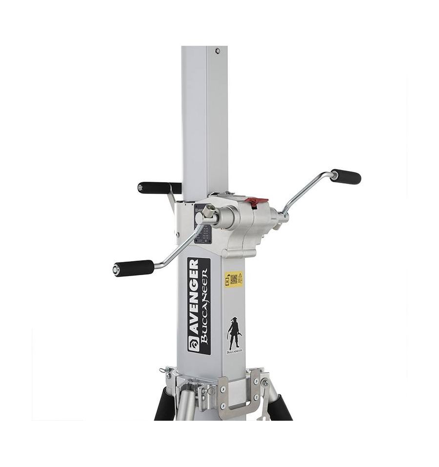 como los otros soportes de iluminación líderes en la industria de Avenger; el Long John Silver y el Long John Silver Junior the Buccaneer se benefician de una manivela de doble manija y un sistema de columna accionado por cabrestante inspirado en el mástil de un barco, lo que significa que la carga útil se puede subir y bajar más rápido que cualquier otro soporte en el mercado. El Buccaneer se asienta sobre tres ruedas rellenas de espuma a prueba de pinchazos con frenoscon bandas de rodadura gruesas adecuadas para múltiples terrenos, además de que cada rueda se beneficia del bloqueo multidireccional, maniobrar el Buccaneer alrededor del set es muy fácil, incluso cuando está completamente cargado.