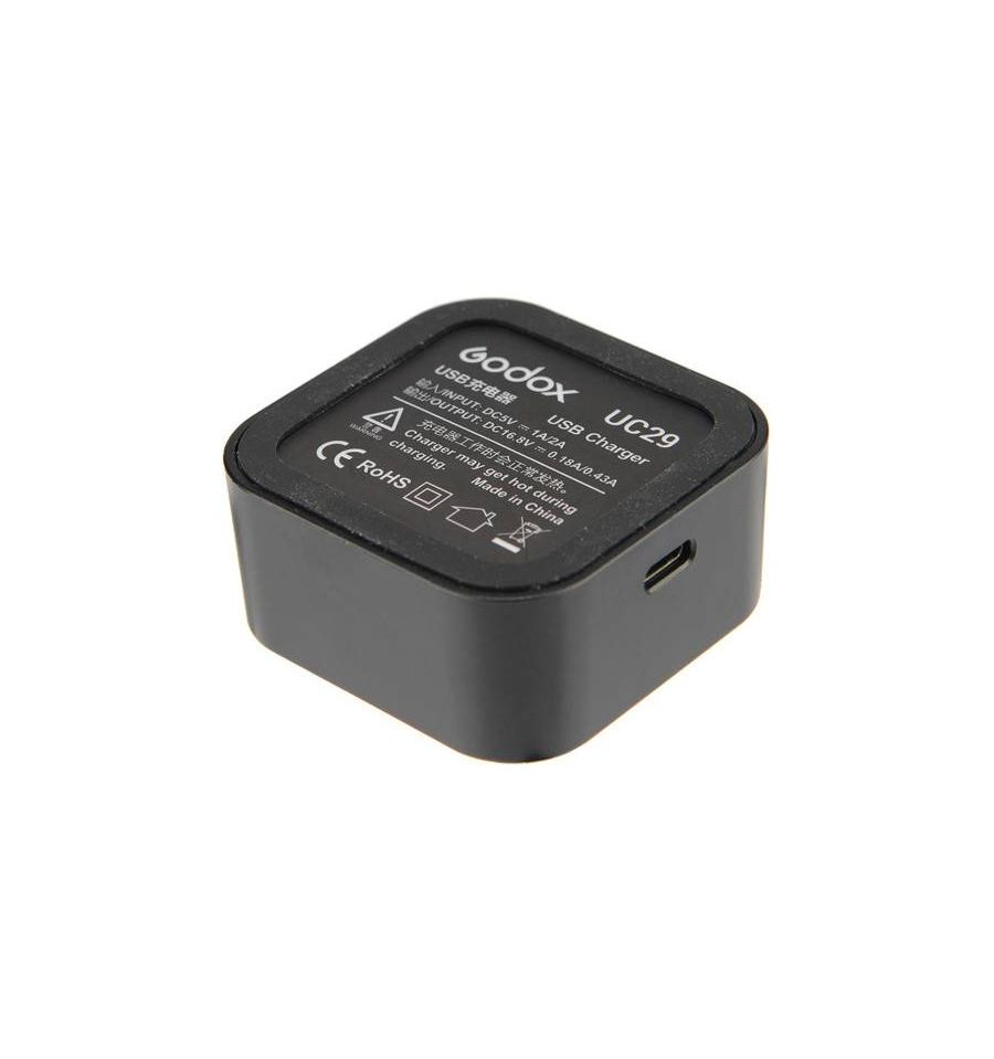 El Cargador USB UC29 para Batería Flash AD200 WB29 de Godox suministra energía a la batería WB29. Cuando está completamente cargada, la batería proporciona hasta 500 flashes a máxima potencia.