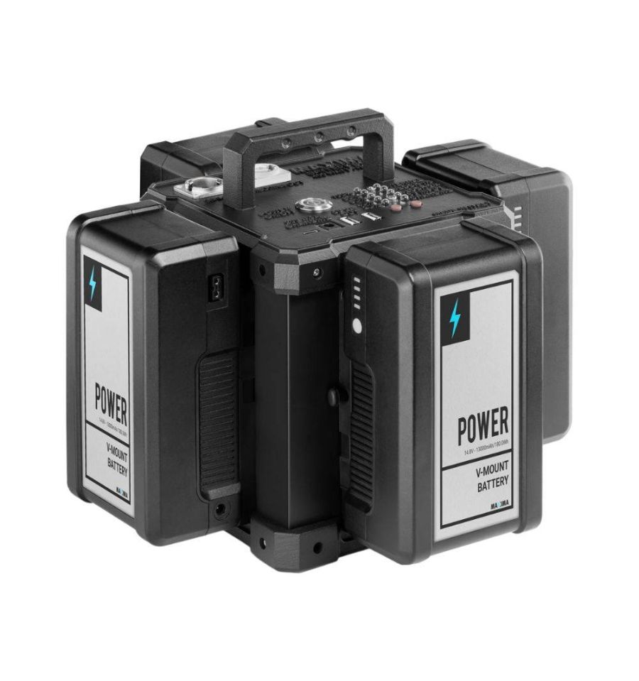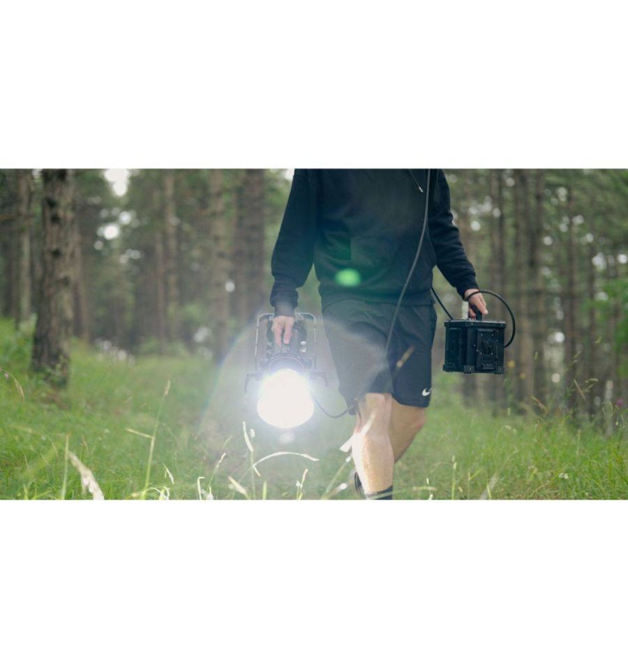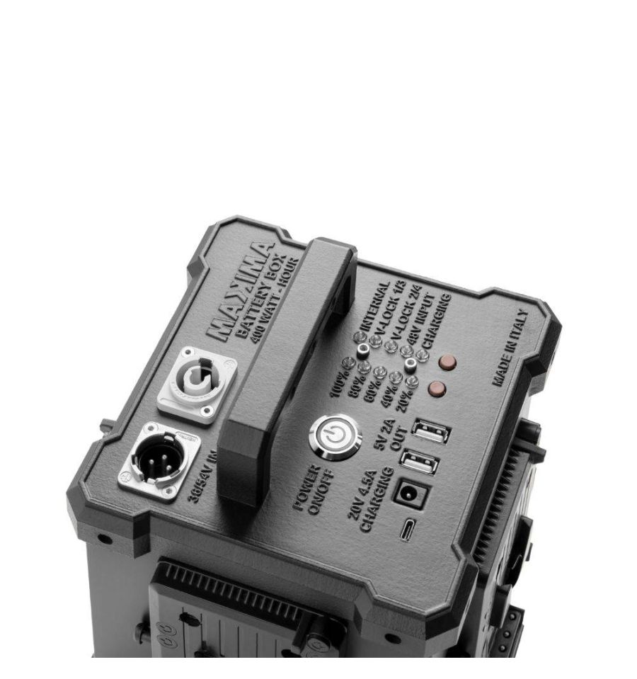 Maxima BatteryBox es un paquete de baterías inteligente que cuenta con una batería de iones de litio integrada de 400Wh y una base externa V-Mount de 4 puntos que, en conjunto, son capaces de alimentar un foco Maxima a plena potencia durante 4 horas. Incluye un cable de neopreno 5m y cargador de batería.