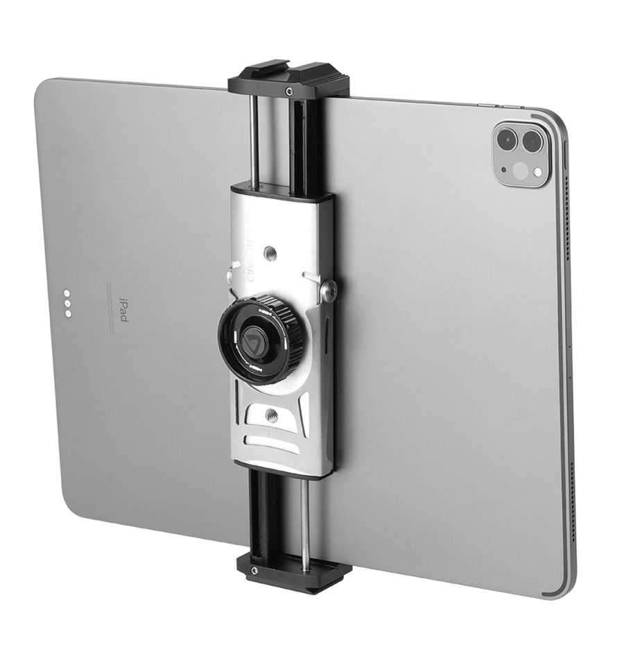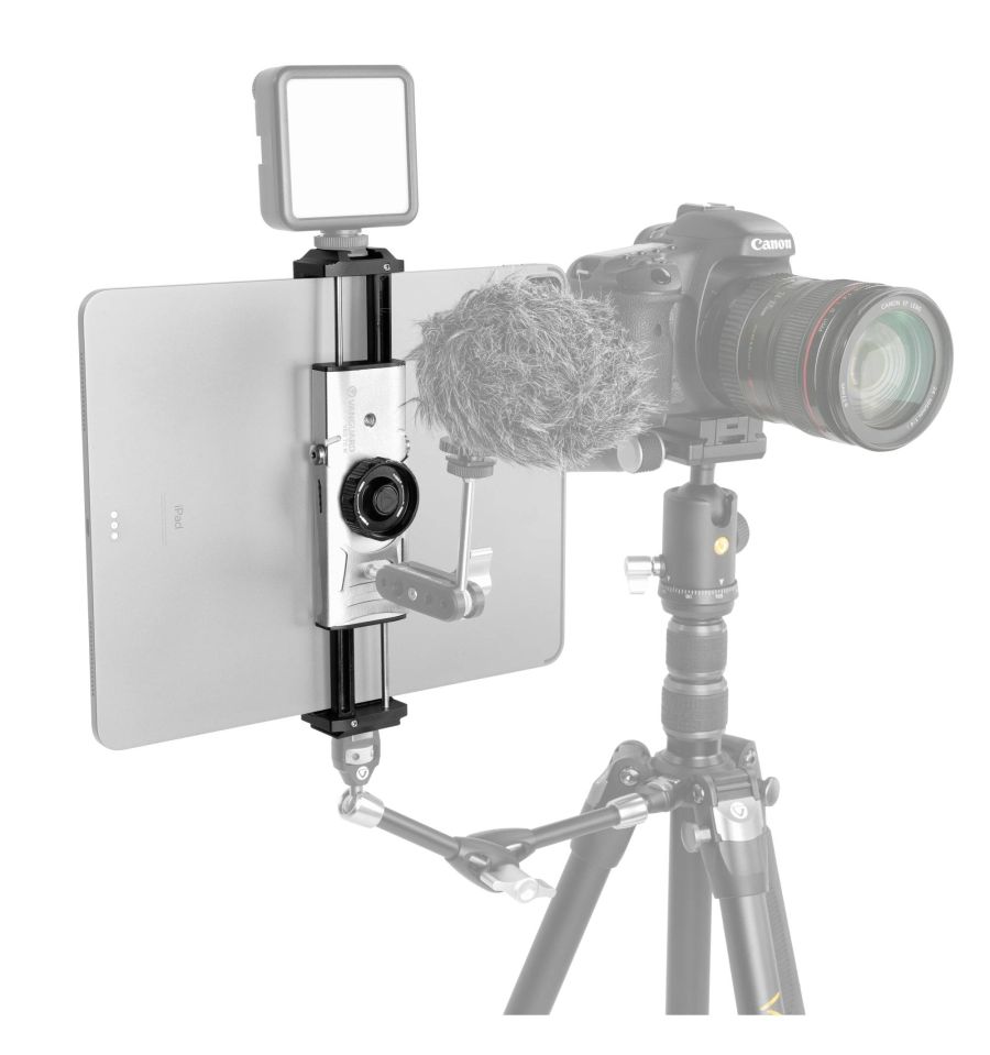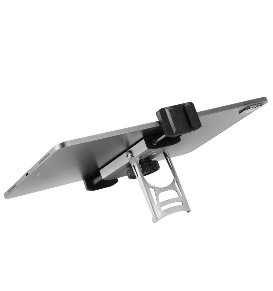 Se puede utilizar por sí sola como un soporte para la tablet que se despliega, o anclarla directamente a una rótula de trípode compatible con Arca Swis, o cualquier rosca de 1/4" como en un brazo de soporte de trípode VEO. El soporte VEO TC M incluye un pie desplegable en acero inoxidable para apoyarlo en cualquier superficie.