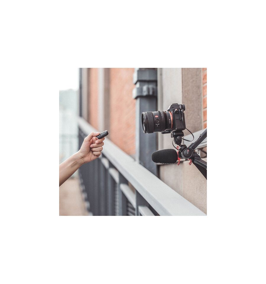 El RC M1 se engancha magnéticamente en trípodes de vlogging de mesa MantisPod 2.0 seleccionados, actuando como un panel de control conveniente y ergonómico.