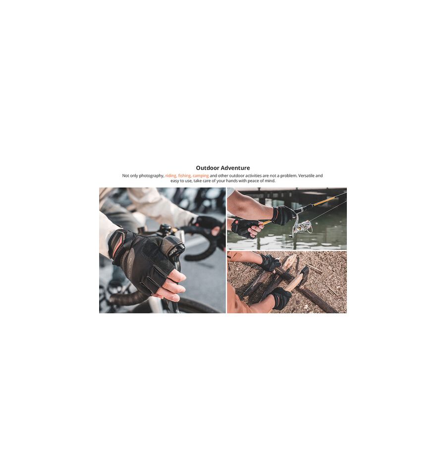 Los Photography Gloves (Fingerless) son guantes diseñados para fotógrafos que buscan protección y comodidad durante sesiones al aire libre, sin sacrificar la capacidad de manejar los controles de la cámara. Ajuste: Correas de velcro para un ajuste personalizado.Materiales duraderos y flexibles. Compatible con el uso de pantallas táctiles.XL (para manos de 23-25 cm de circunferencia de palma).Pueden soportar temperaturas de aproximadamente -5°C a 10°C sin afectar la flexibilidad ni el confort.