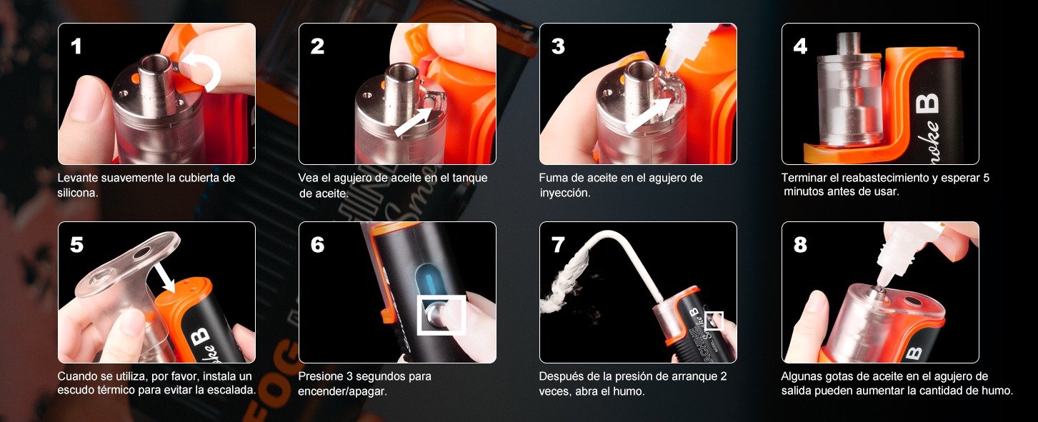 La máquina de humo para fotografía viene con 6 botellas de 12 ml de líquido de niebla, hechas de propilenglicol y glicerina vegetal. Simplemente agregue el líquido en el tanque de aceite de 12 ml de la máquina de humo, espere unos minutos a que el líquido alcance la temperatura correcta para que se vaporice, y estará listo para comenzar.
