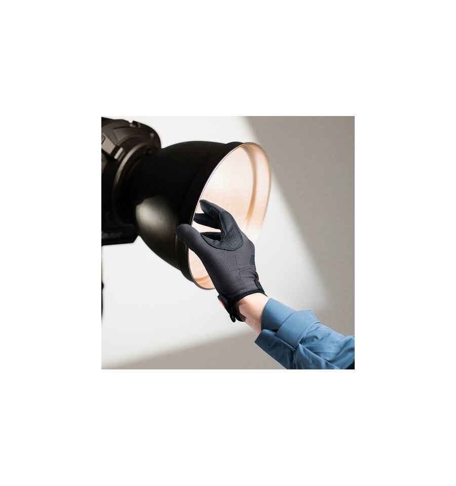 La palma y la articulación del pulgar están confeccionadas con un exterior de microfibra, lo que proporciona un agarre excepcional y una durabilidad superior, permitiendo un manejo preciso de los equipos de iluminación. Esto es especialmente útil en entornos complejos donde cada movimiento cuenta, y la precisión es crucial. Además, el interior está reforzado con una capa de material termoaislante Y-WARM, que actúa como una barrera efectiva contra las altas temperaturas, protegiendo las manos de quemaduras o incomodidades durante largas jornadas de trabajo.