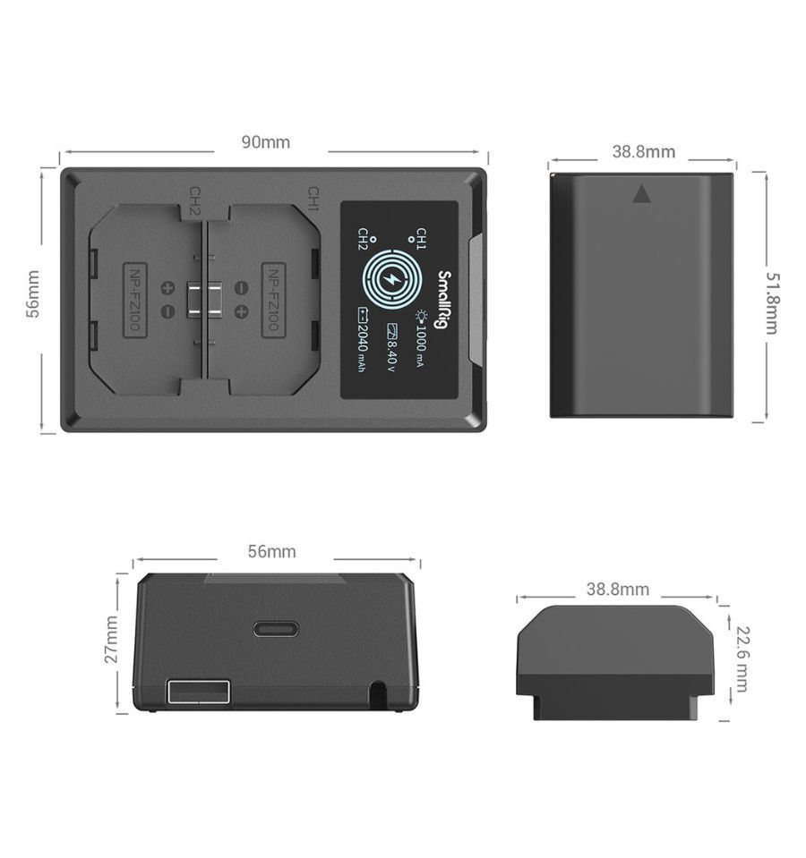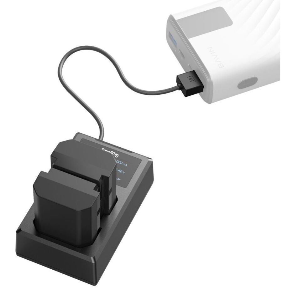 El kit NP-FZ100 con 2 baterías y cargador USB de doble bahía de SmallRig incluye un cargador con cable USB-A integrado, lo que permite conectarlo directamente a adaptadores de corriente USB estándar para pared. También cuenta con un puerto de entrada USB-C, por lo que puedes conectarlo a una batería externa u otra fuente de alimentación utilizando un cable USB-C opcional.
