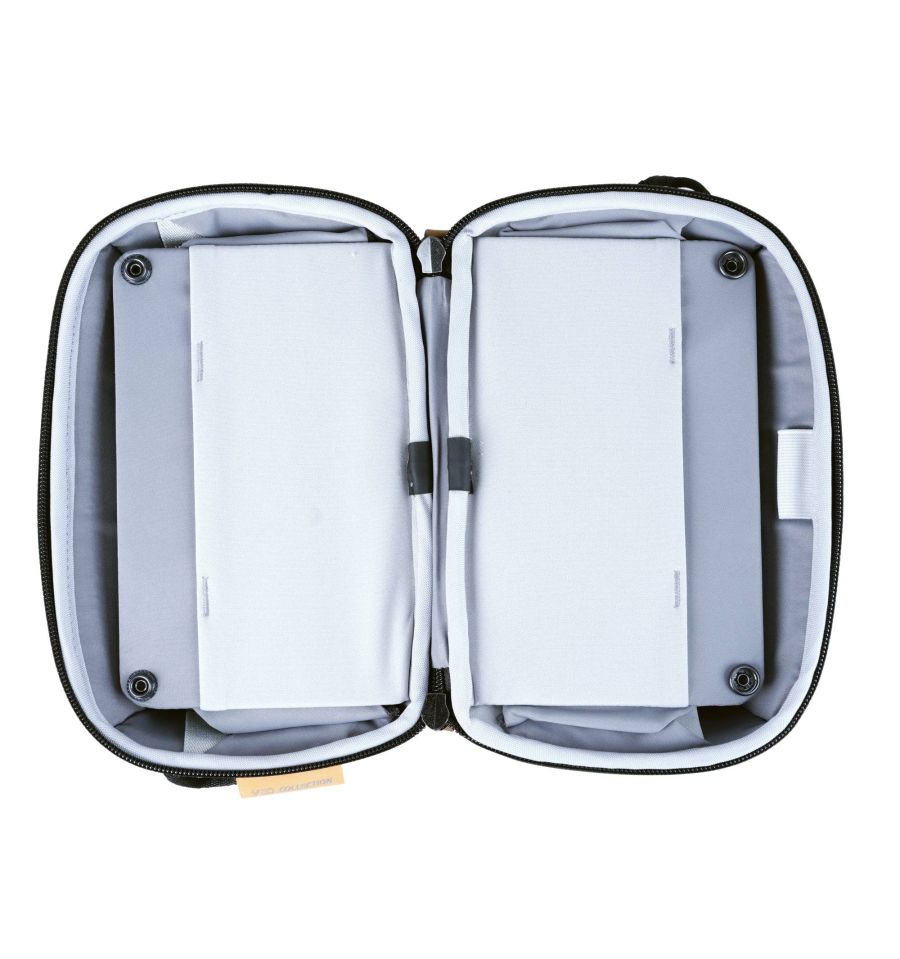 VEO CITY TP es una colección de prácticas bolsas tecnológicas que permiten llevar tu equipo mucho más fácil. Están pensadas para ser una bolsa multifuncional y se caracterizan por su apertura 180º, lo que permite aprovechar al máximo su potencial de almacenamiento y acceso a los pequeños accesorios. Están diseñadas para usarse principalmente como una bolsa de mano, para guardar tus accesorios tecnológicos o cualquier otro kit que se te ocurra (primeros auxilios, etc.). Sin embargo, también incluye unas prácticas correas que permiten llevarla como bolsa de hombro, con un sistema que impide que se pueda abrir del todo y evitar que se caiga tu equipo al suelo. Las correas son extraíbles, y por tanto, tu eliges el cómo llevar tu bolsa Veo City TP.