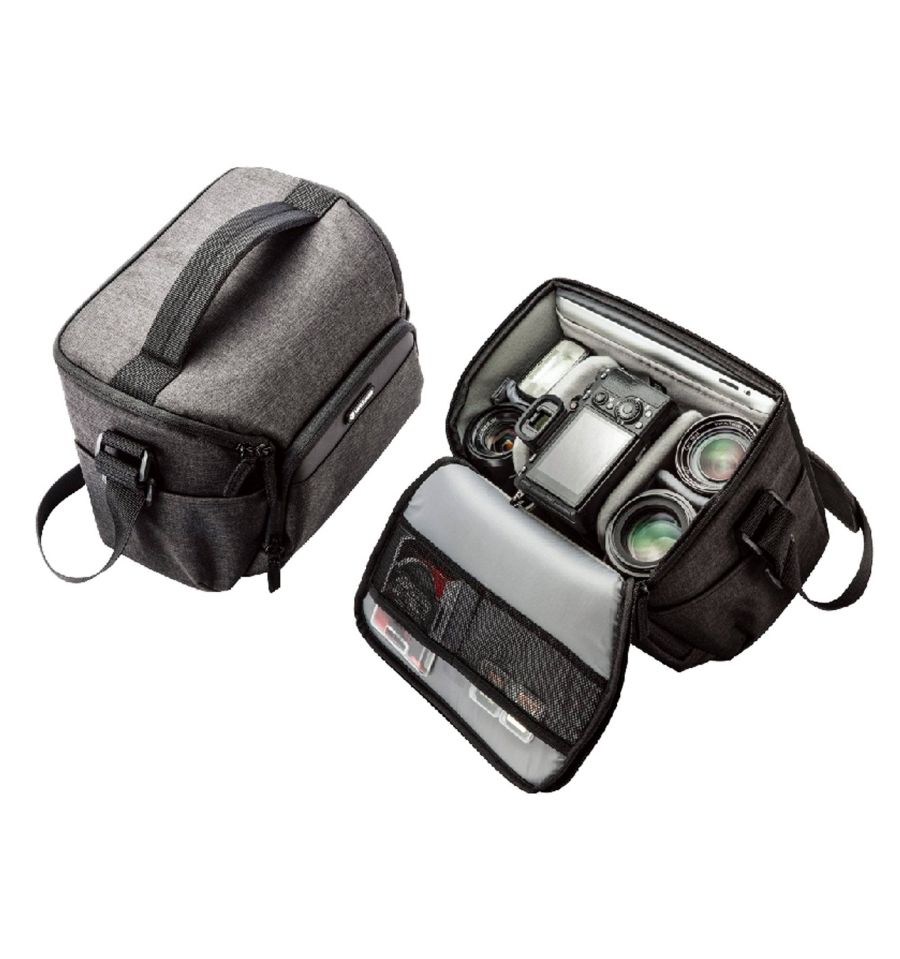 Vesta Aspire 15GY es una bolsa de hombro compacta para equipo de fotografía DSLR con un objetivo incorporado, un flash y accesorios, con múltiples bolsillos adicionales.