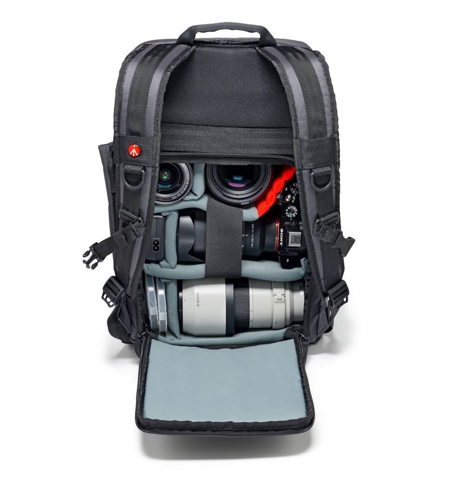 El compartimento interno altamente funcional presenta la nueva carcasa Flexy Camera Shell, un innovador sistema de protección diseñado por Manfrotto.