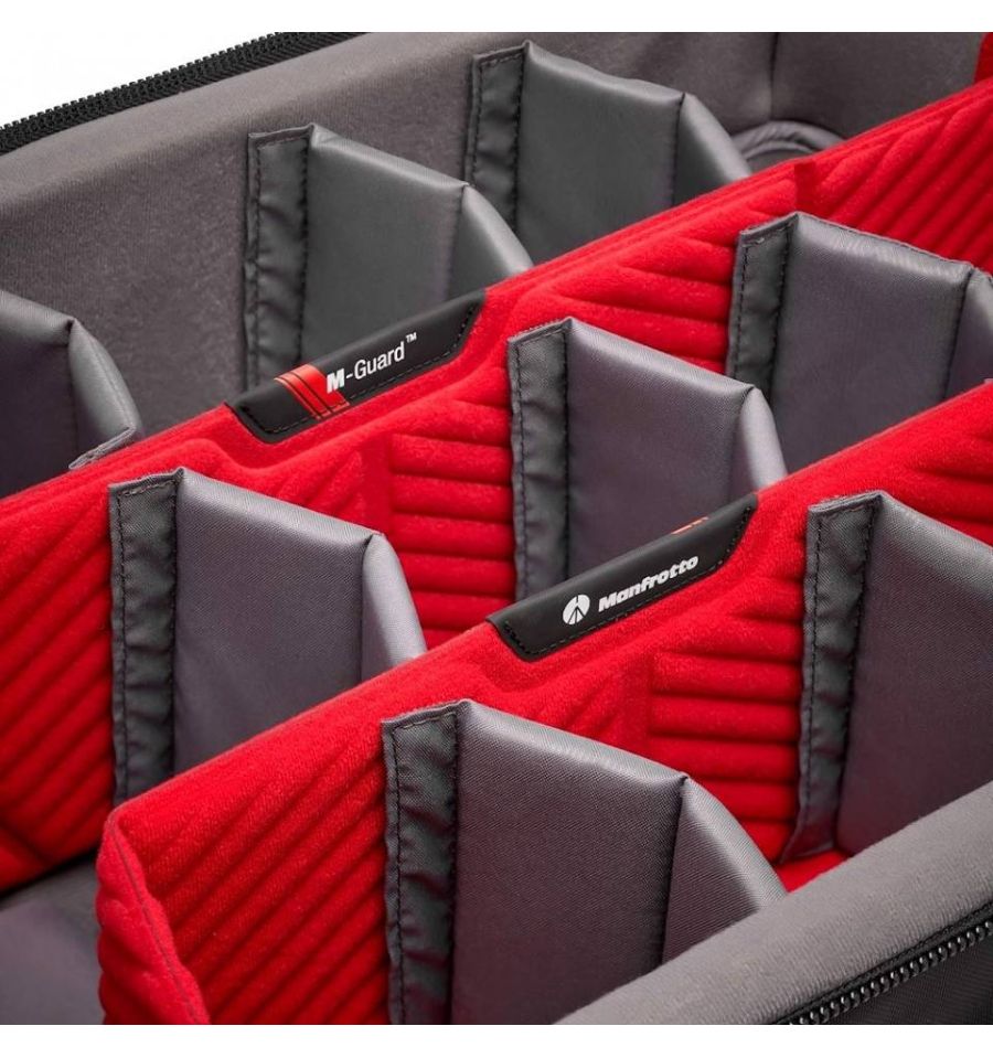 El compartimento acolchado para la cámara cuenta con el sistema de protección M-Guard™ de Manfrotto. Fabricado con espuma EVA especial de alta densidad, proporciona una respuesta excepcional de absorción de impactos con un perfil súper delgado. Los patrones de plegado personalizables permiten la máxima versatilidad para proteger completamente el equipo de la cámara mientras se maximiza el uso del espacio.