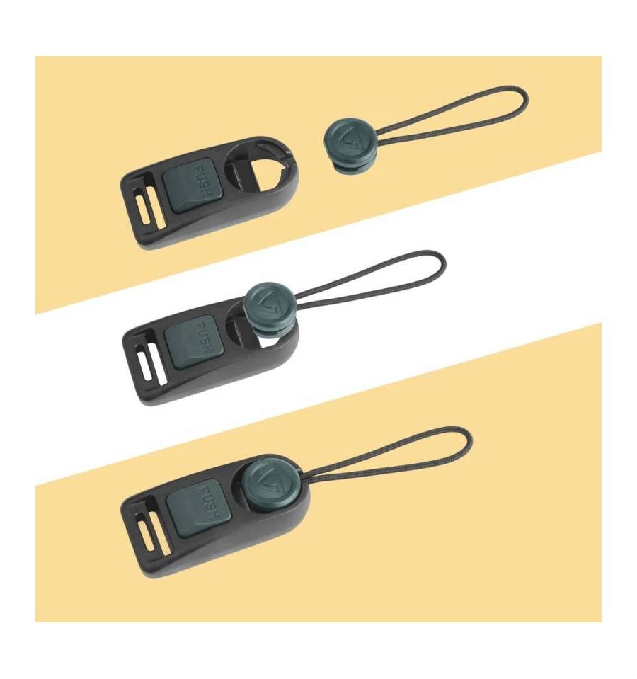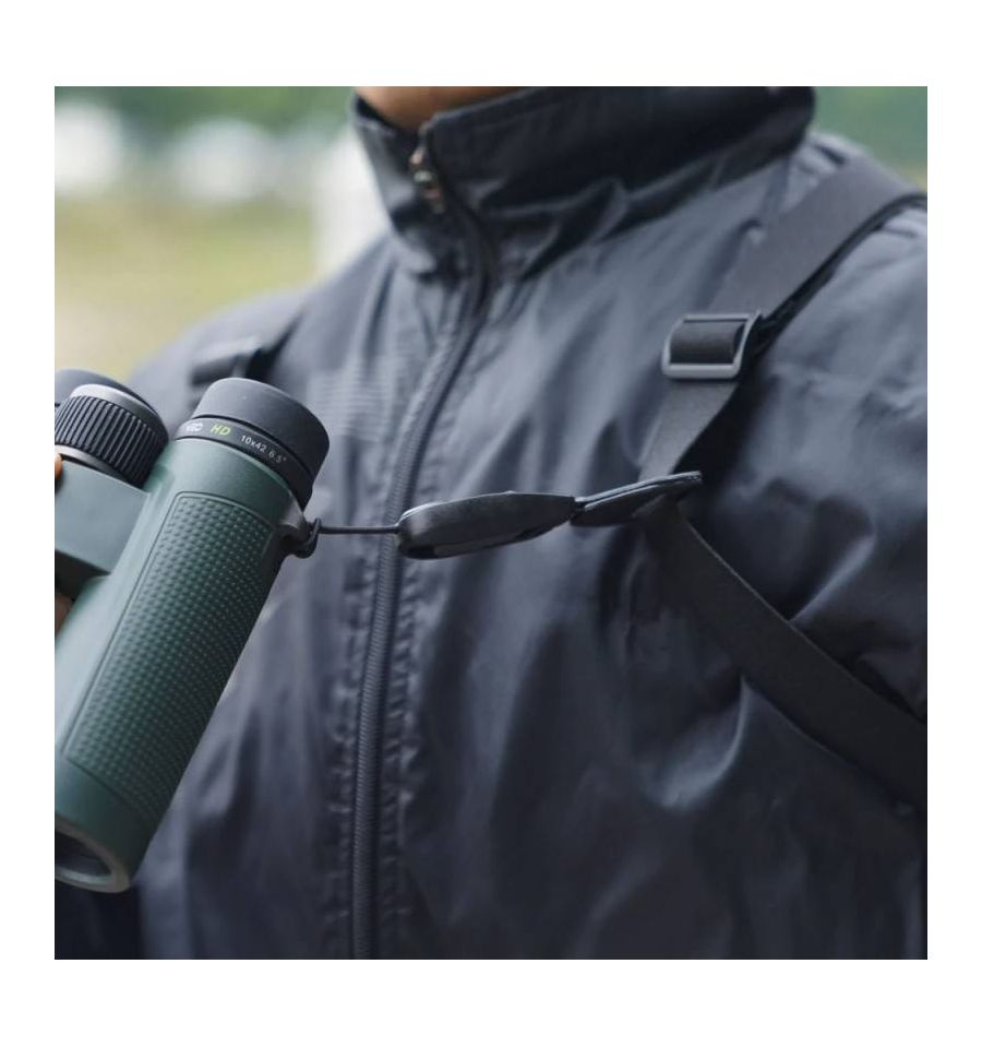 Solo tienes que colocar los clips en la óptica elegida y encajarlos en la hebilla de cierre de la correa o arnés que prefieras llevar. La hebilla de liberación rápida incluye un botón mediante el cual podremos acoplar y desacoplar de forma segura el clip. Este se mantendrá fijo y seguro cuando se use, y para liberarlo, simplemente presiona el botón de la hebilla y retíralo.