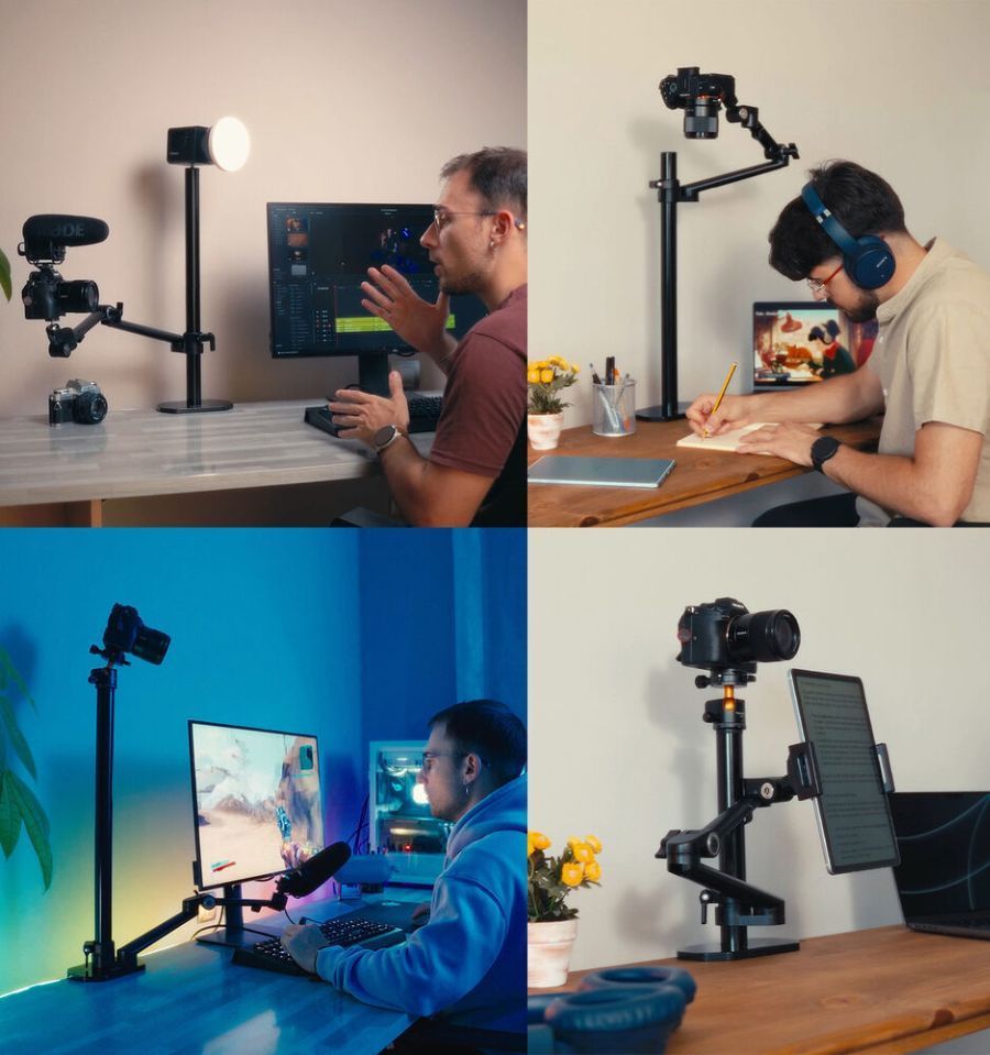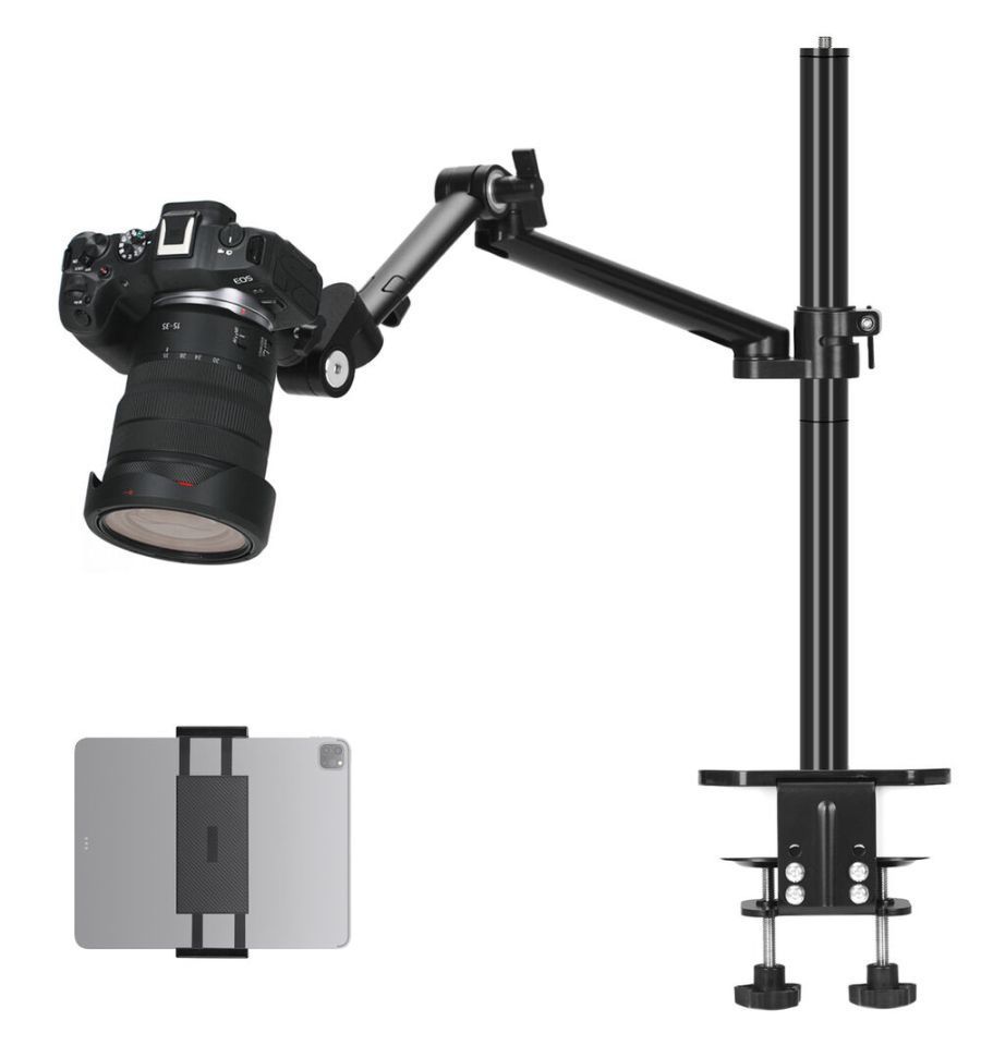 Monta tu cámara, luz, micrófono o accesorio en una superficie con este soporte de escritorio Titanrig LITE Z con soporte para tablet y brazo articulado de TARION.