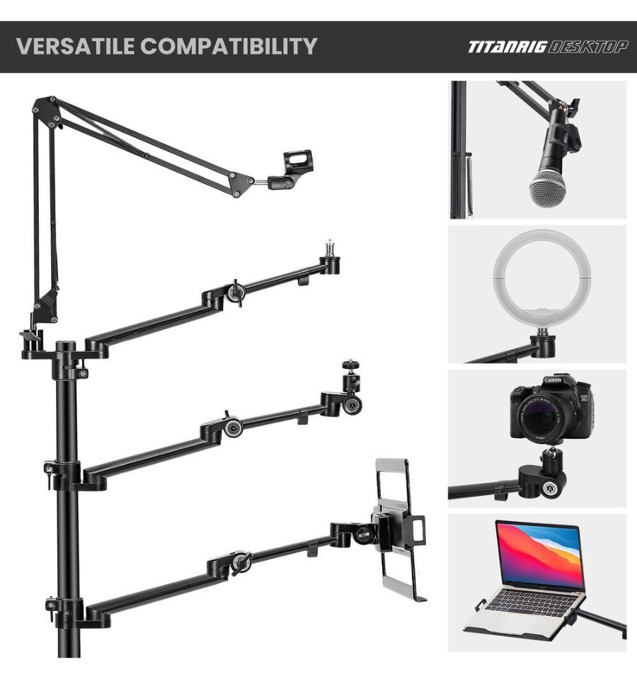 Crea tu espacio ideal con el Tarion TitanRig Desktop, un soporte multifunción 4 en 1 para transmisiones en vivo que combina 4 brazos articulados para cámara, micrófono, monitor/ordenador y luz de relleno. El diseño integrado de este soporte para cámara optimiza el espacio en el escritorio y lo mantiene ordenado.