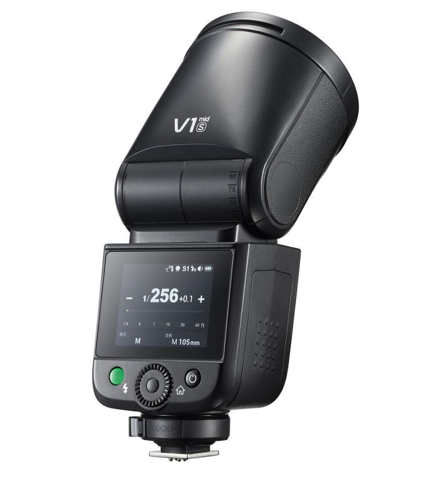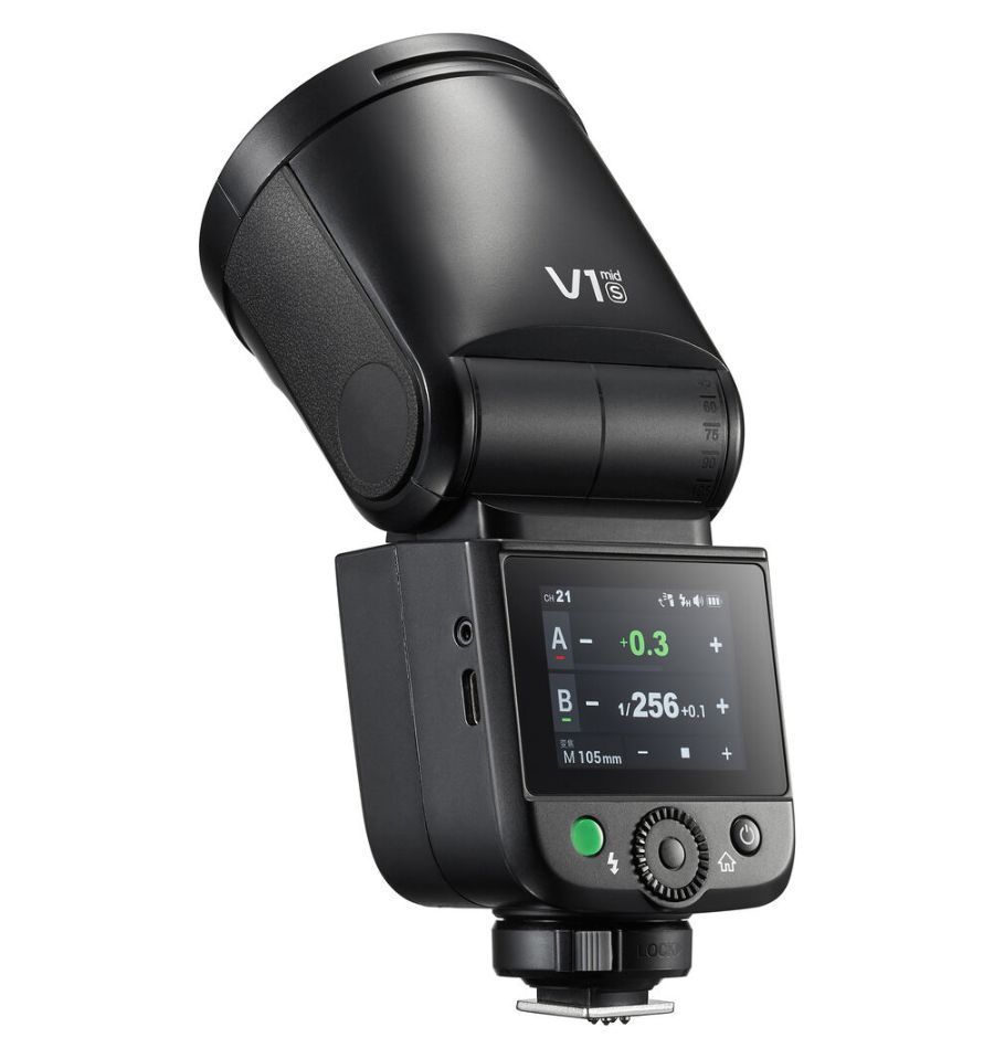 Alimentado por una batería recargable de 7,2V y 2200mAh (incluida), el V1mid S ofrece un tiempo de reciclado de 1,7 s, 650 destellos a plena potencia y una duración del destello entre 1/600 y 1/20.000 s.