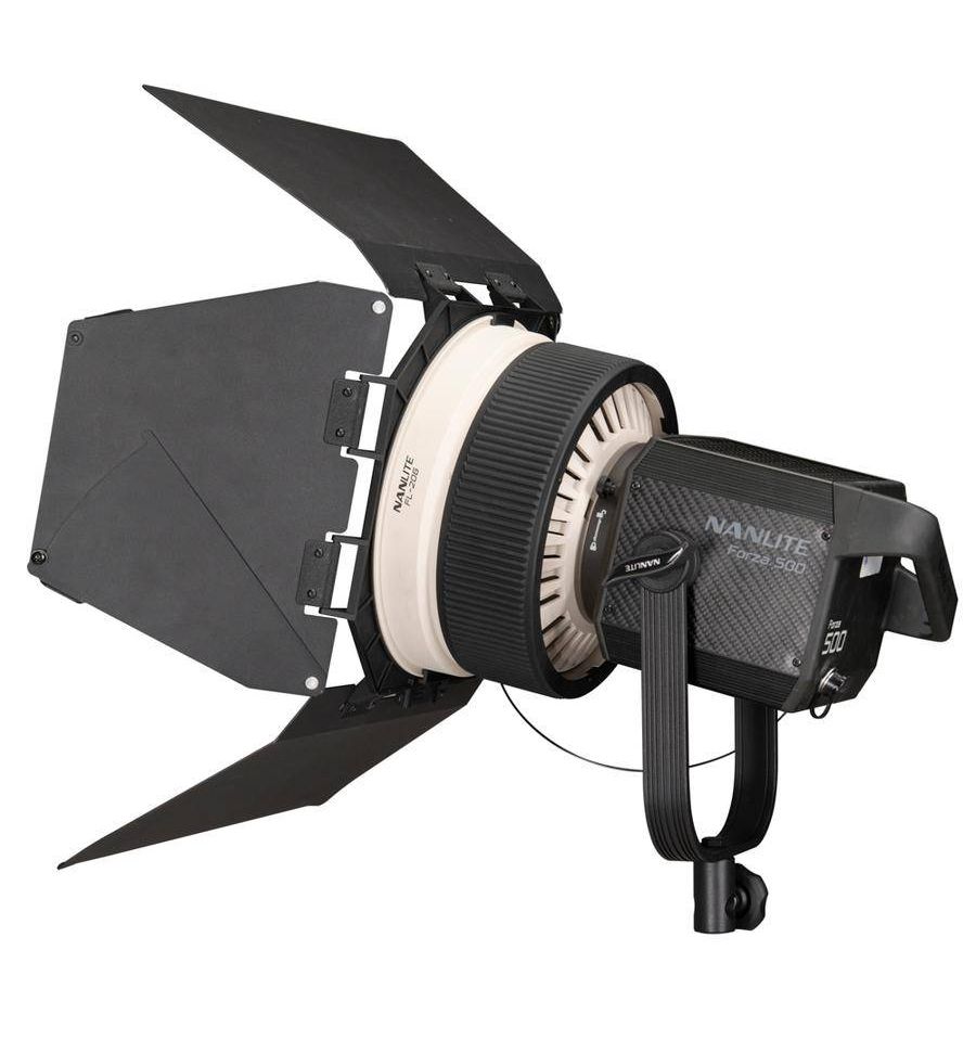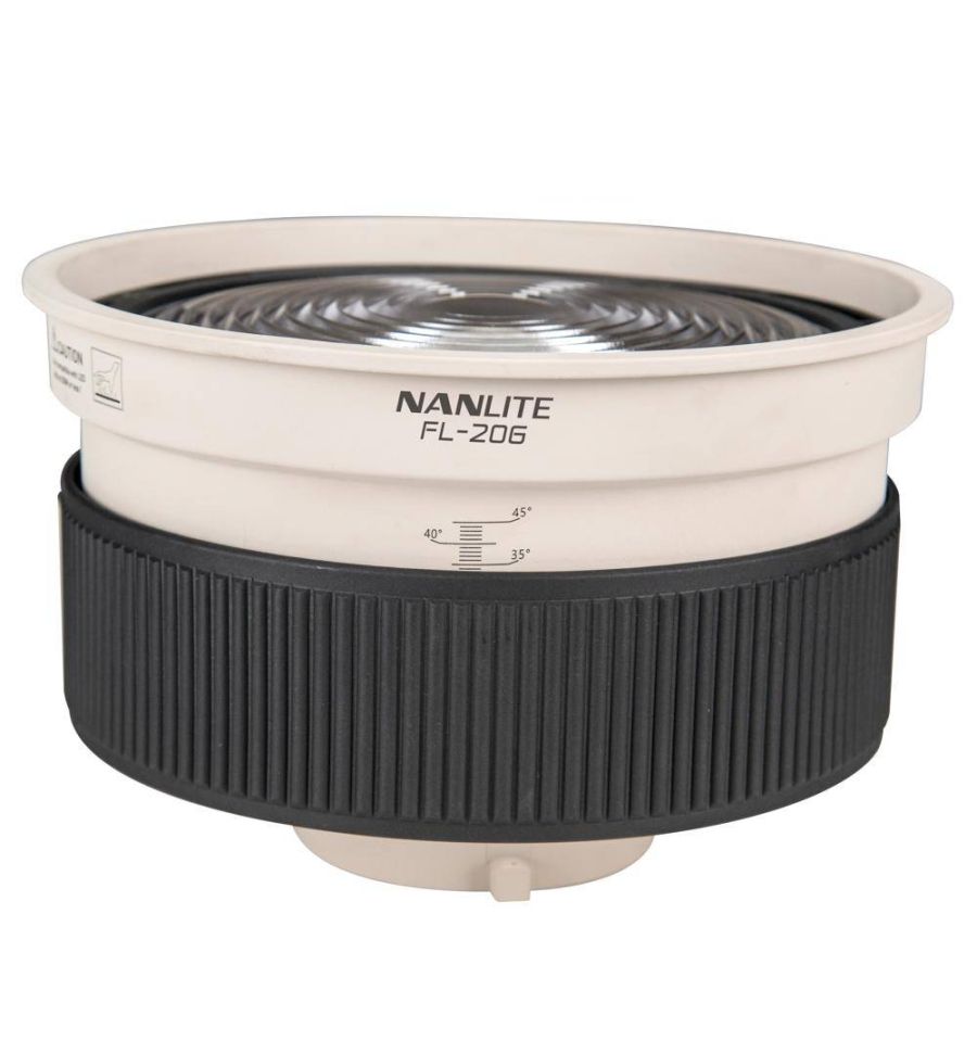 Lente Fresnel Nanlite FL-20G para Forza 200, Forza 300 y Forza 500. Lente Fresnel de vidrio con una carcasa de longitud ajustable que enfoca la salida de luz. Permite el ajuste del ángulo del haz de luz puntual (10 °) a inundación (45 °). Incluye puertas de metal y un soporte tipo S Bowens.