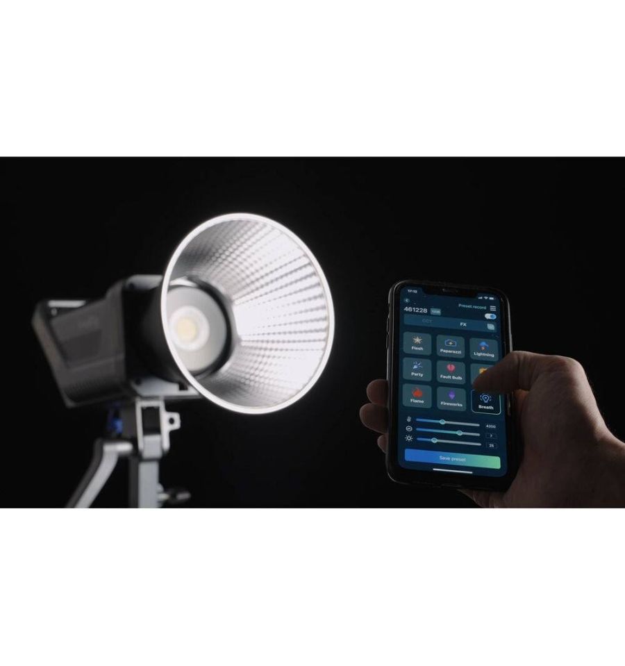 Alimente el dispositivo con la fuente de alimentación de CA/CC incluida o con una batería de 14,4 V/26 V suministrada por el usuario mediante un cable de alimentación opcional D-Tap a XLR de 3 pines. El ventilador de enfriamiento integrado se enciende automáticamente para evitar que la luz se sobrecaliente y, con 27 db, el ventilador es más silencioso que un refrigerador o la mayoría de los susurros. Con modos de nueve efectos para efectos de iluminación creativos, el accesorio se puede utilizar para una variedad de efectos dramáticos. Para agregar softboxes y otras herramientas de modelado/difusión de luz, el accesorio es compatible con los accesorios de control de luz Bowens. Una pantalla de visualización integrada le permite ver la configuración de las luces de un vistazo, mientras que para los ajustes puede controlar la luz localmente o a través de la aplicación SmallGoGo, que brinda control inalámbrico sobre su dispositivo desde una distancia de hasta 330'.