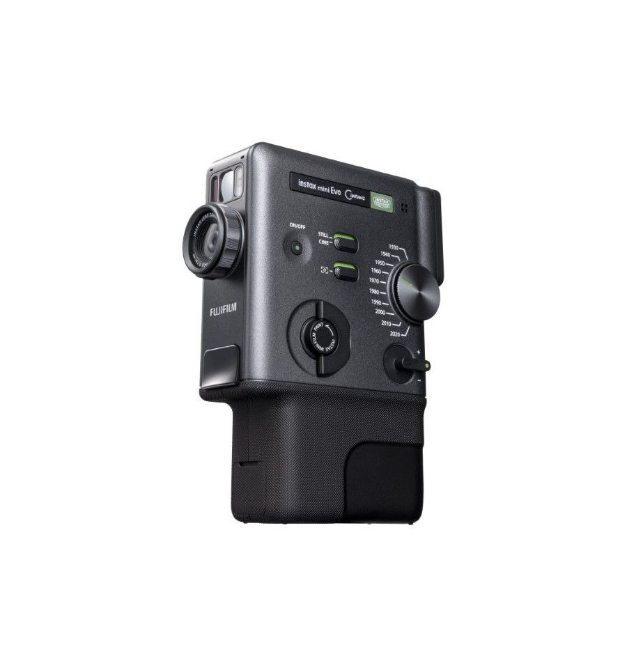 La instax mini Evo Cinema™ es la cámara instantánea híbrida más cinematográfica de la familia instax, un modelo 3 en 1 que integra grabación de vídeo, fotografía digital e impresión instantánea instax mini en un solo cuerpo compacto. Inspirada en las clásicas cámaras de 8 mm, luce un diseño negro vertical con empuñadura, detalles analógicos y visor acoplable que refuerzan su carácter retro, pero con toda la tecnología actual.