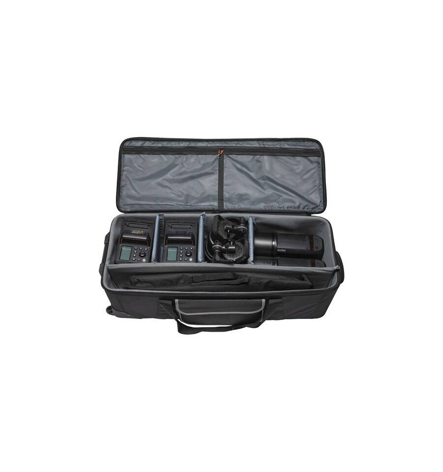Maleta de estudio reforzada Godox CB-06 para equipos de iluminación Incluye un separador longitudinal para separar pies, paraguas, etc y 3 separadores transversales para separar flashes, focos, etc. Cuenta con 2 compartimentos con cremallera en la tapa así como con un bolsillo exterior con velcro. Dimensiones: interior: 94cm * 34cm* 25cm Capacidad para 4 pies de estudio de 3 metros, 4 flashes grandes o 6 pequeños, cables, paraguas y otros accesorios.
