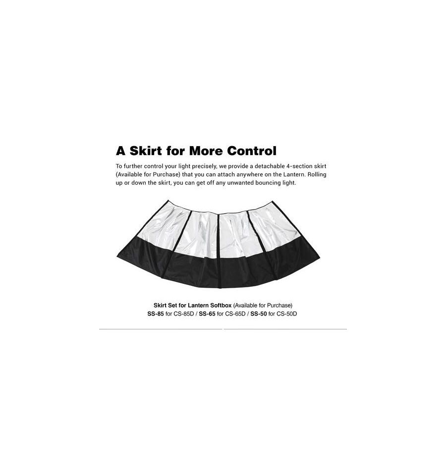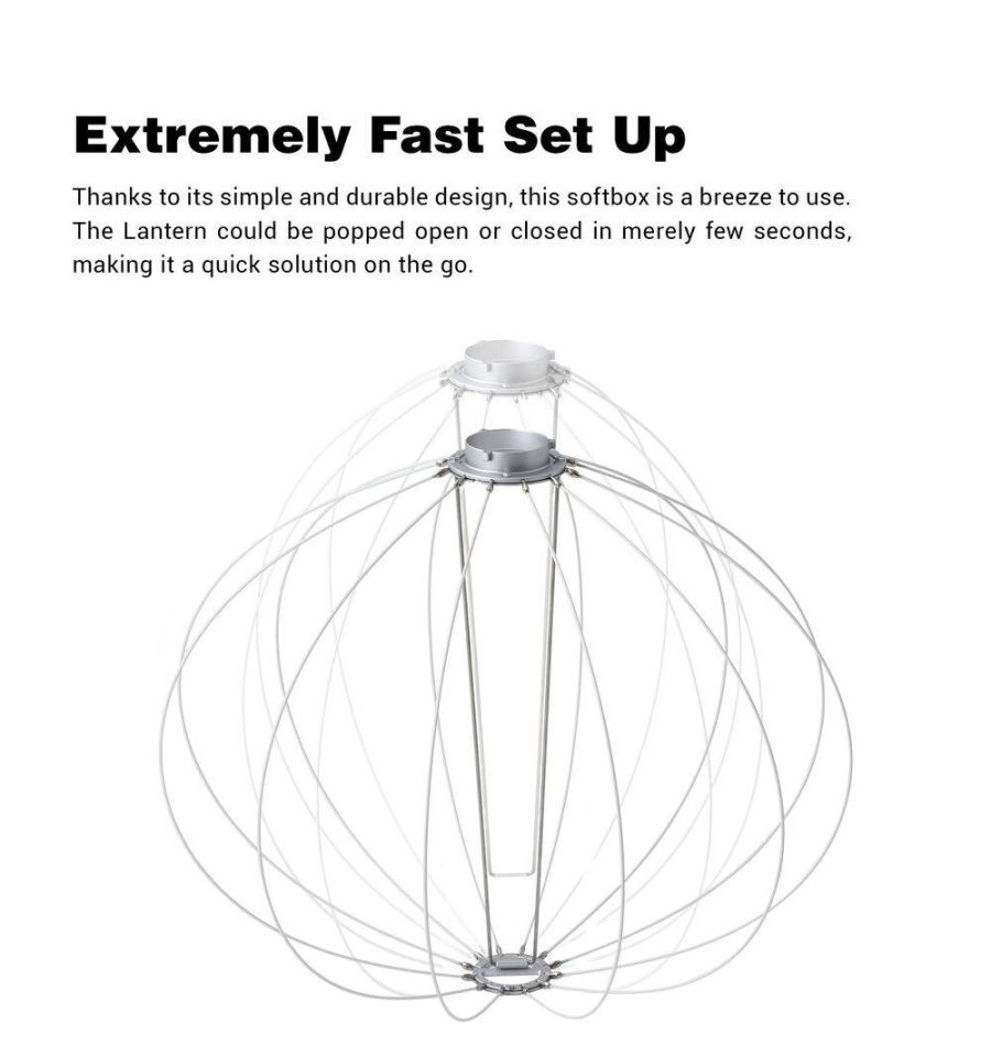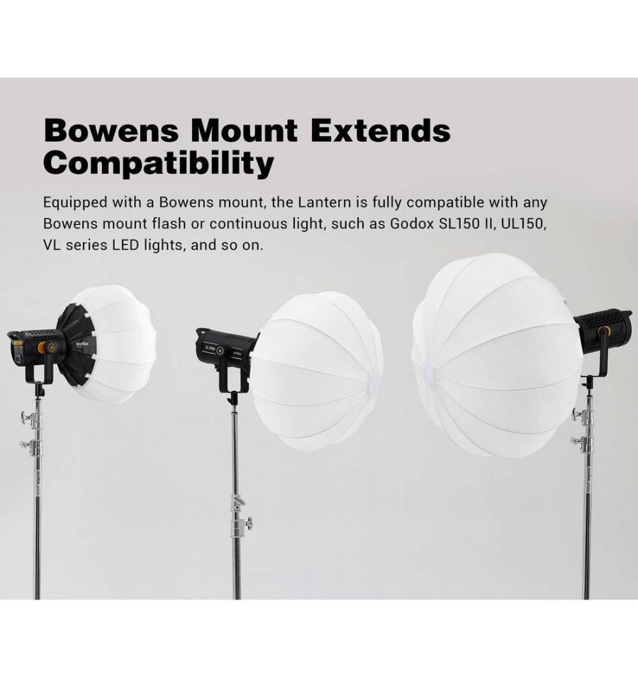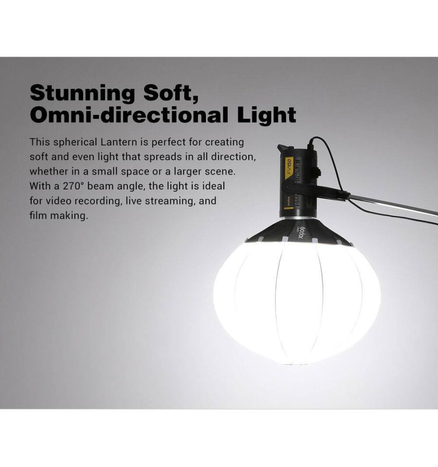 Ideal para usar sobre la cabeza o para elevar el nivel de iluminación ambiental, esta caja de luz de linterna plegable CS50D de Godox tiene un diámetro de 19.7 " (50 cm) y la misma calidad de luz omnidireccional que las "bolas chinas" de antaño. Construido con materiales duraderos, cuenta con accesorios como un conjunto de faldón opcional para controlar la dispersión del haz de 270° La linterna tiene una montura Bowens que se adapta a las luces Godox como las series SL150 II, UL150 y VL, pero también es compatible con muchas otras luces que usan este popular montar.