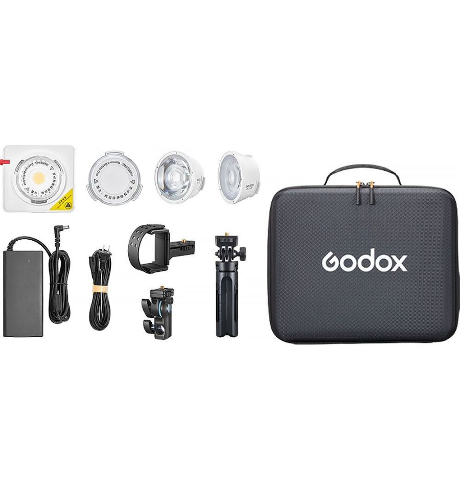 - Incluye: Adaptador de corriente, bolsa de almacenamiento, soporte para banco de energía, soporte Godox AD-E2 ,soporte para batería externa , reflector de lente de 15º y 36º, y mini trípode