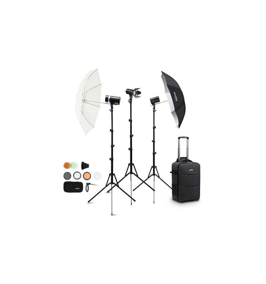 Para aquellos que quieren una iluminación de calidad de estudio en la carretera, el kit de 2 luces Godox AD100Pro y Ad300Pro es la configuración para usted. El kit incluye dos flashes AD100Pro y un flash AD300Pro. Cada luz viene con su propio soporte y puede usar el snoot, las viseras y los filtros incluidos, así como intercambiar los paraguas translúcidos y los negros y plateados de 34". Se incluye un estuche para almacenamiento y transporte.