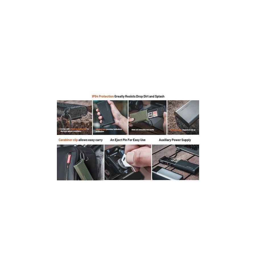 Tiene clasificación IP54, lo que ayuda a proteger contra caídas, suciedad y salpicaduras, y es compatible plug-and-play con Windows 7 y posteriores, macOS 10.6 y posteriores, Linux, Android y iPadOS mediante un puerto USB integrado de 10 Gb/s. Cable C 3.2 Gen 2. También se incluye un puerto USB-C que proporciona hasta 5 V/2 A de potencia y ayuda a garantizar transferencias de datos estables, mientras que un adaptador microSD a SD incluido permite a los usuarios trabajar con medios microSD en la ranura para tarjetas SD.