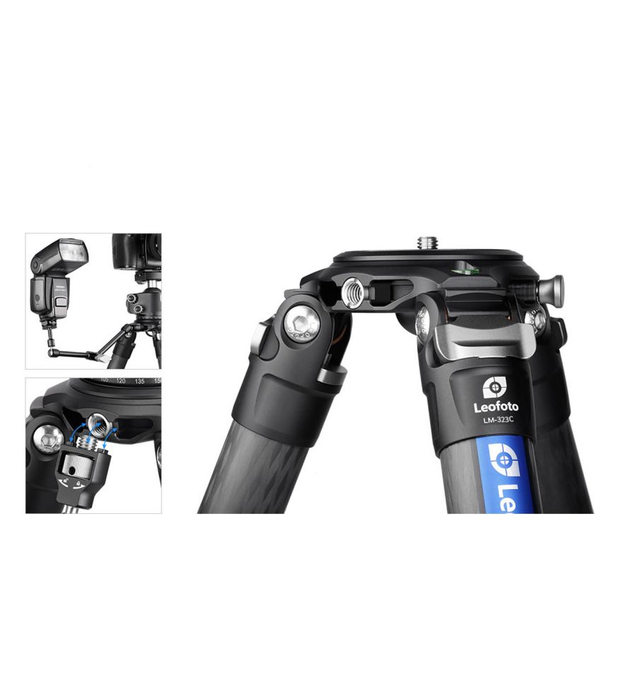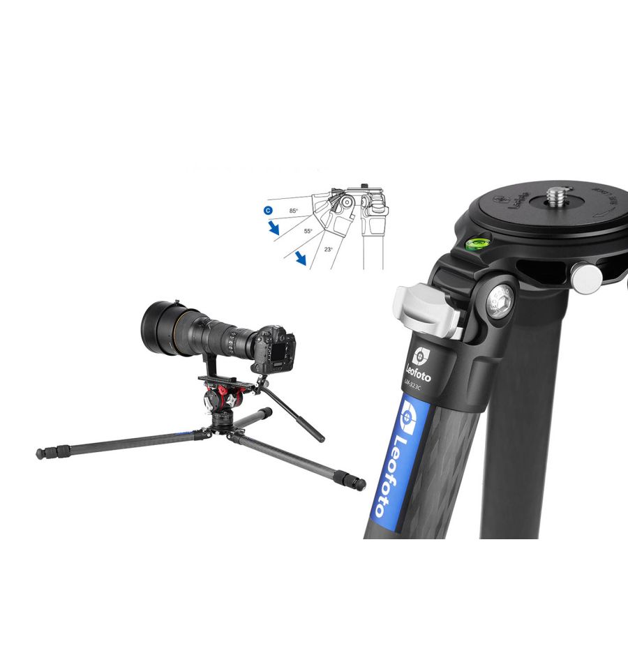 Trípode de carbono Leofoto LM-323C Summit sin columna central. Esta fabricado en carbono 10x capas y aluminio aeronáutico 6061 / 7075. Tiene 3 secciones. Patas con movimiento independiente. Diámetro de los tubos: 32 / 28 / 25 mm.