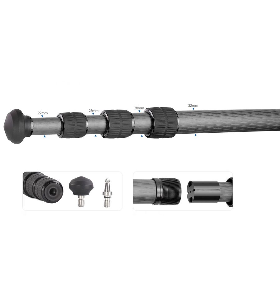 Trípode Leofoto LM-324C Summit sin columna central. Esta fabricado en carbono 10x capas y aluminio aeronáutico 6061 / 7075. Tiene 4 secciones. Patas con movimiento independiente. Diámetro de los tubos: 32 / 28 / 25 y 22 mm.