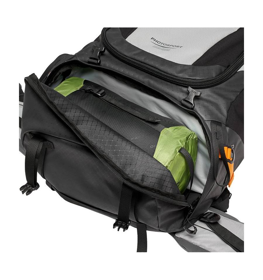 La mochila PhotoSport PRO 55L AW III no solo ofrece espacio para tu equipo fotográfico, sino que también cuenta con suficiente espacio para llevar elementos esenciales de senderismo y campamento. Podrás llevar contigo un saco de dormir, una tienda de campaña, comida, una chaqueta y bastones de trekking suficientes para las necesidades de un viaje de varios días. ¡Nunca más tendrás que preocuparte por la falta de espacio!