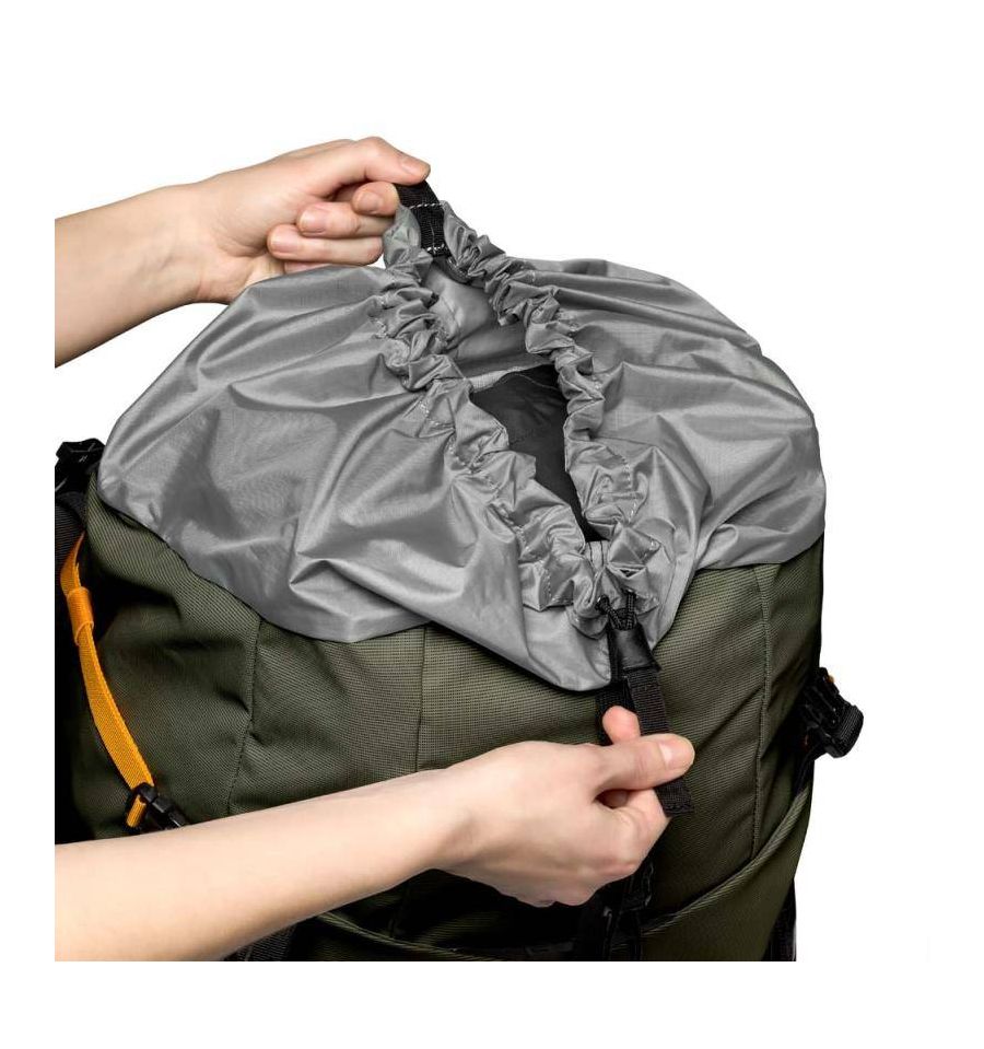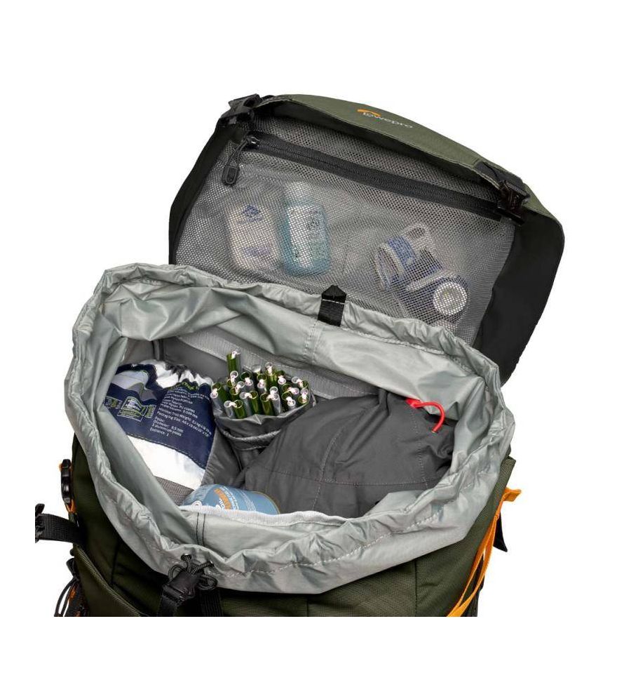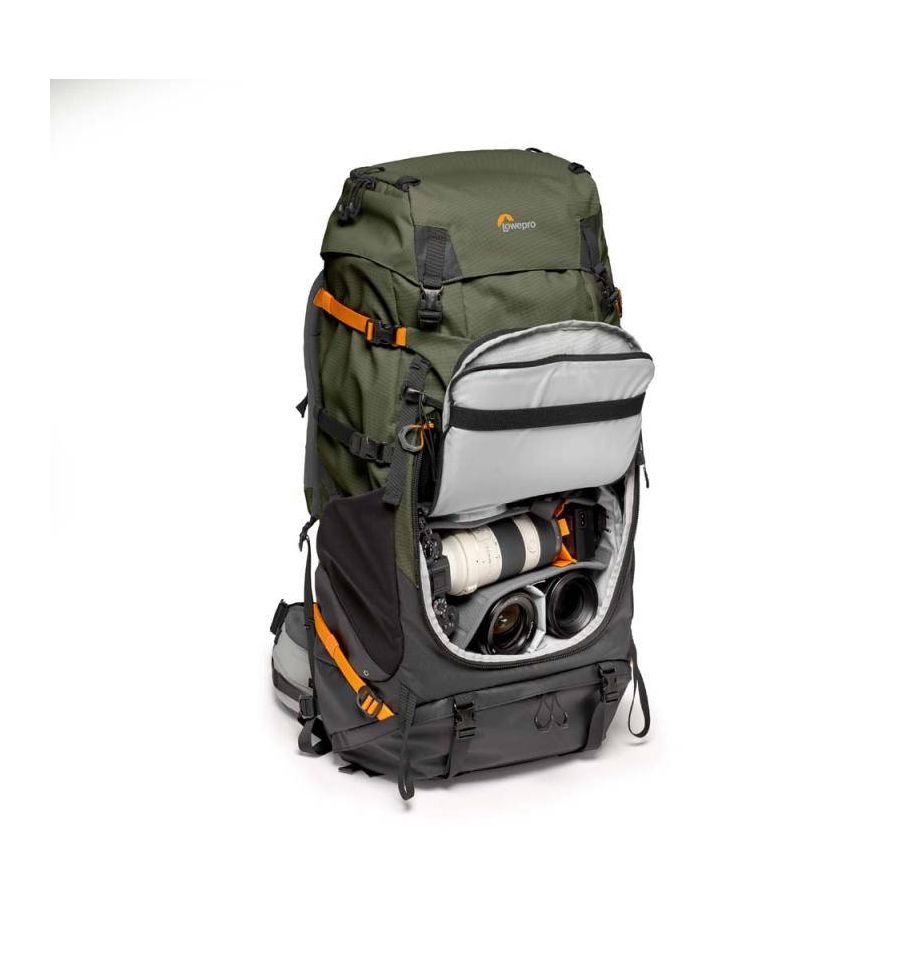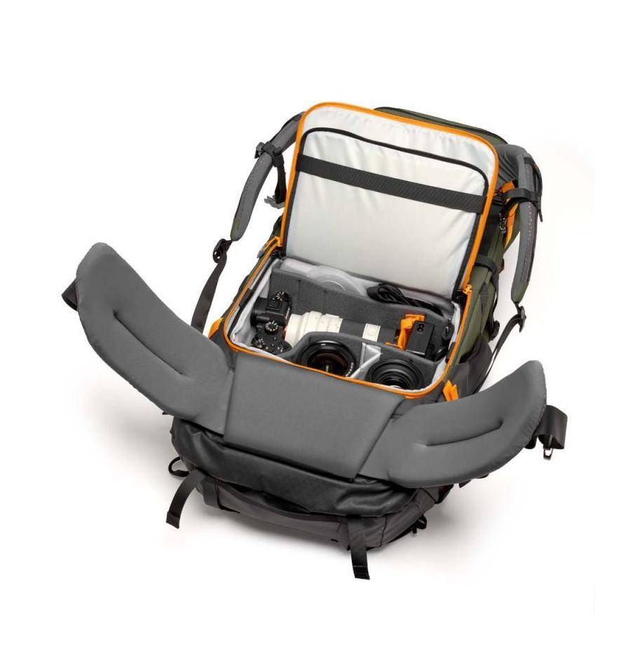 No solo podrás llevar tu equipo fotográfico, sino que también tendrás espacio suficiente para llevar elementos esenciales de senderismo y campamento. Podrás llevar un saco de dormir, una tienda de campaña, comida, una chaqueta y bastones de trekking, todo lo necesario para una aventura de varios días.