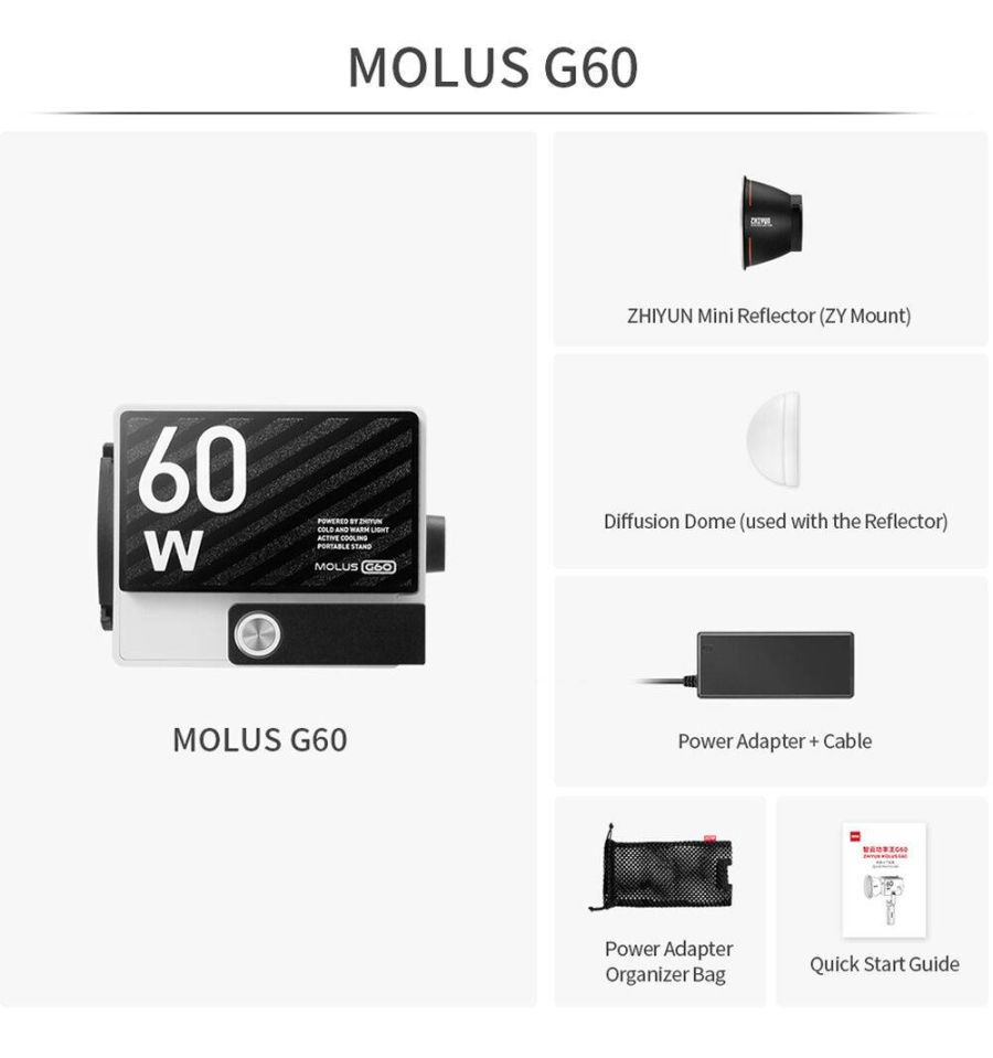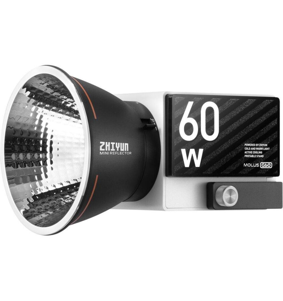 - El Molus G60 desafía las convenciones de la iluminación para cine, ofreciendo el foco más ligero (300 gramos) y capaz de rendir increíblemente bien en múltiples entornos profesionales como retrato, bodegón, anuncios de televisión, entrevistas, etcétera.