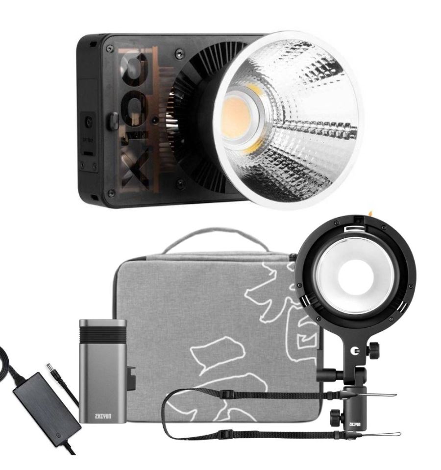 Incluido con el Zhiyun Molus X100 Pro: Molus X100, adaptador Bowens, empuñadura con batería, bolsa de transporte, correa, parábola mini ZY, adaptador de corriente, bolsa para el adaptador, guía rápida de uso.