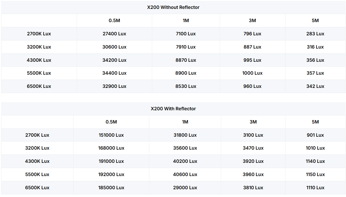 - 8900, Los datos se obtienen probando una fuente de luz COB sin accesorios con una temperatura de color de 5500 K y un brillo del 100 % a una distancia de 1 metro.