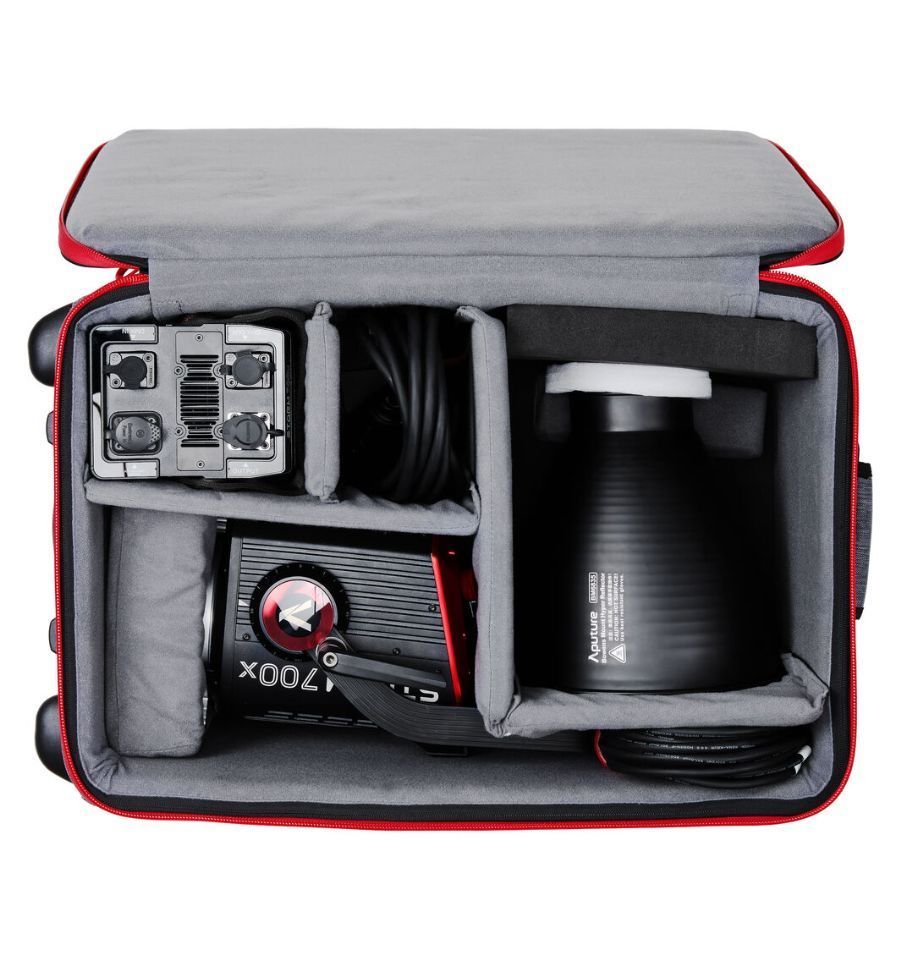 La STORM 700x se entrega con un reflector de 35°, una unidad de control, una pinza, cables de cabeza y alimentación, y una maleta blanda con ruedas que permite transportarlo todo.