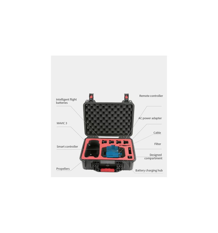 Este estuche ha sido meticulosamente diseñado para proteger y transportar el Mavic 3 de manera segura. Fabricado con materiales duraderos, garantiza una resistencia excepcional ante el desgaste diario. Su interior acolchado proporciona una protección superior contra golpes y caídas, asegurando que tu equipo esté siempre en óptimas condiciones. Además, su diseño compacto facilita el transporte, permitiéndote llevar tu dron a cualquier lugar sin complicaciones.