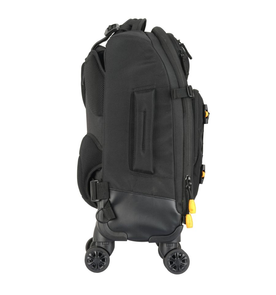 La versatilidad es clave en este modelo: puedes utilizarlo como un trolley ágil gracias a sus 4 ruedas y asa de doble barra, o convertirlo en mochila mediante su arnés ergonómico ocultable, que incluye una cubierta para las ruedas para evitar manchas al cargarla en la espalda. Su base reforzada es resistente al agua y a los arañazos, e incluye una funda completa para la lluvia.