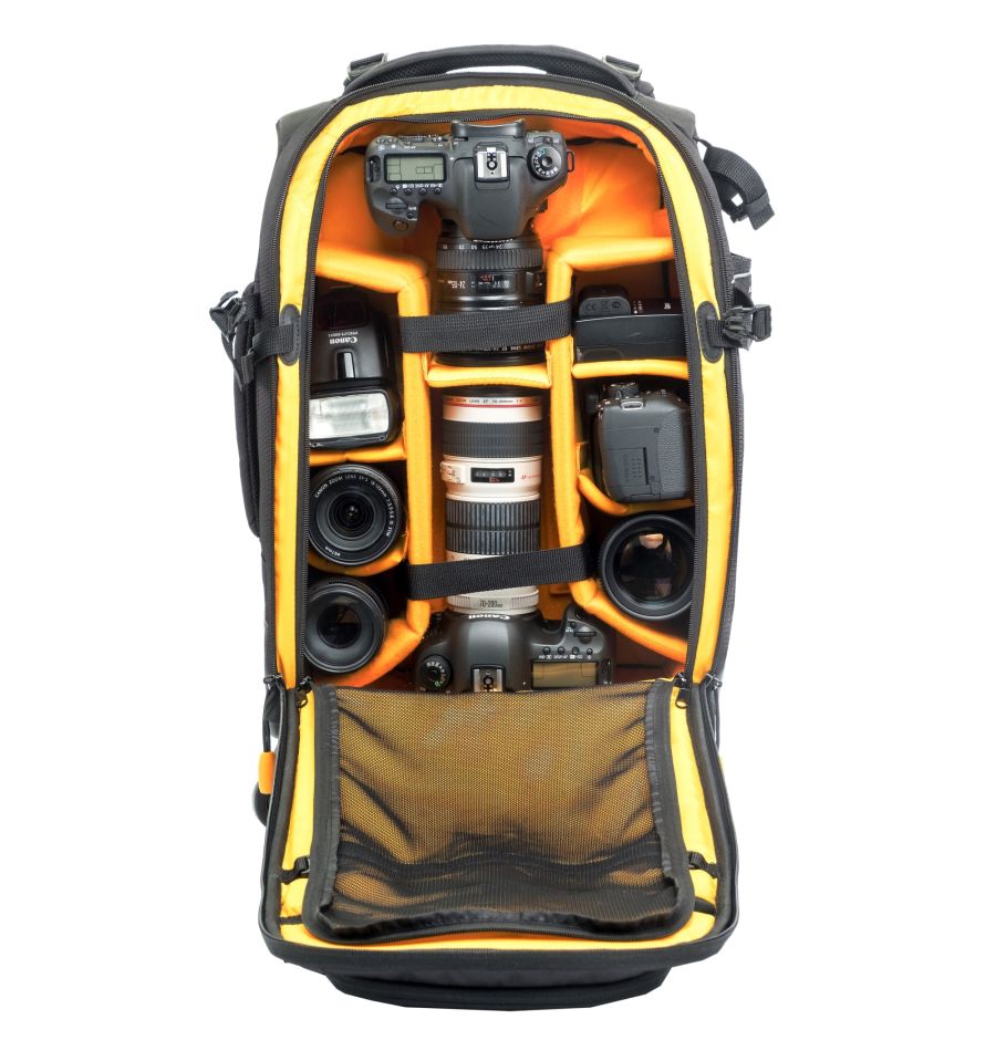 Su interior es totalmente personalizable, ofreciendo una capacidad excepcional para albergar hasta 2 cámaras CSC con 6 objetivos, o bien 2 cámaras DSLR con 4-5 objetivos (incluyendo un teleobjetivo 70-200mm f/2.8), además de flash y accesorios esenciales. Cuenta con compartimentos específicos para un portátil de hasta 14" y una tablet de 9", manteniendo toda tu tecnología organizada y protegida.
