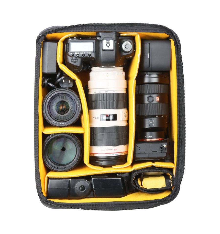 Cuando se utiliza para el equipo fotográfico, la bolsa extraíble para la cámara está diseñada para transportar una DSLR profesional con empuñadura y 5-6 objetivos (hasta 300 mm f2,8 o 150-600 mm), pero su interior personalizable puede configurarse para proteger múltiples equipos de fotografía y observación. La tapa superior de la bolsa interna está diseñada para plegarse y esconderse dentro de la mochila, para permitirte tenerla abierta para un fácil acceso trasero a su kit completo.