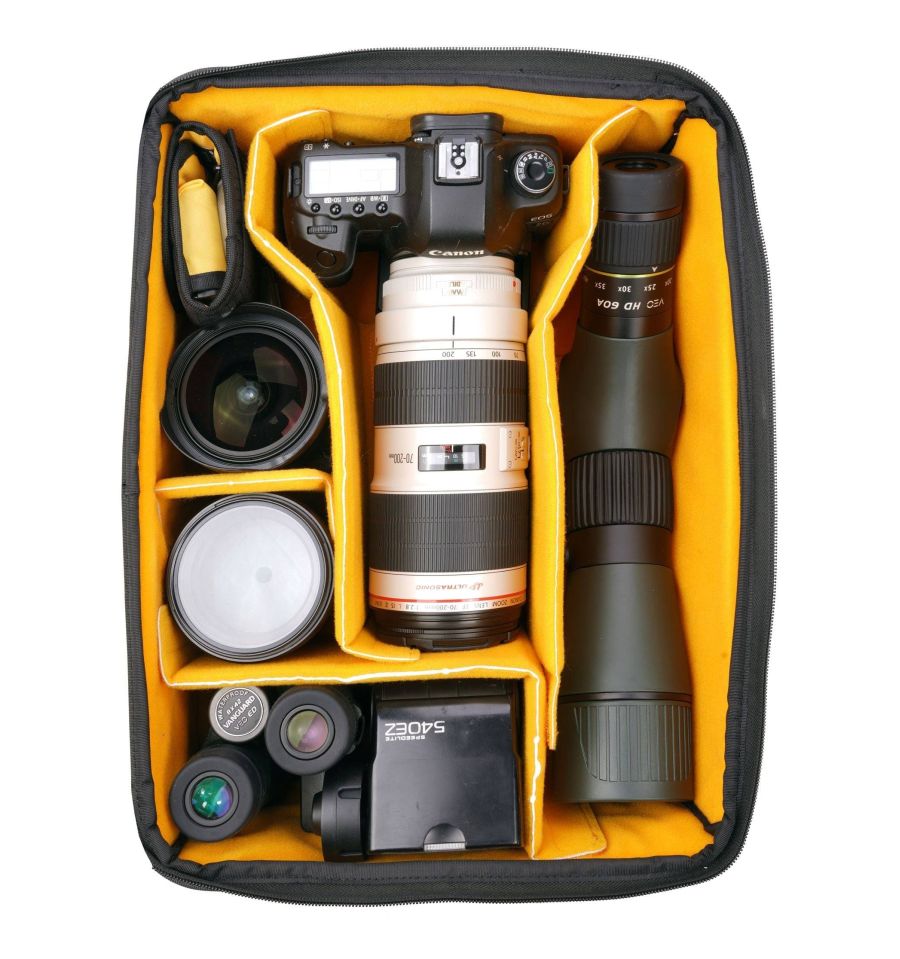 Cuando se utiliza para el equipo fotográfico, la bolsa extraíble para la cámara está diseñada para transportar una DSLR profesional con empuñadura y 6-7 objetivos (hasta 400 mm f2,8 o 200-600 mm de zoom), pero su interior personalizable puede configurarse para proteger múltiples equipos de fotografía y observación. La tapa superior de la bolsa interna está diseñada para plegarse y esconderse dentro de la mochila, para permitirte tenerla abierta para un fácil acceso trasero a su kit completo.