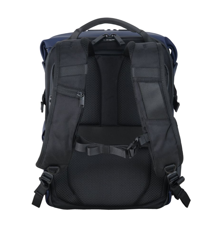 El compartimento principal de seguridad, con acceso posterior, permite alojar una cámara profesional con 2 o 3 objetivos, un flash o incluso un dron DJI Mavic con sus respectivos controladores y baterías. Además, dispone de: