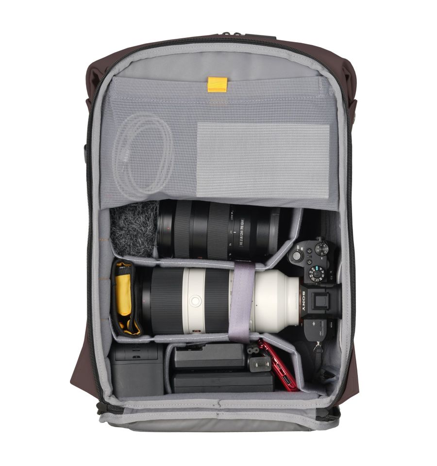 Su diseño inteligente cuenta con un acceso principal trasero para máxima seguridad, permitiendo organizar una cámara Mirrorless o DSLR junto con 3-4 objetivos, un flash o incluso un dron tipo DJI Mavic con sus accesorios. Además, dispone de un acceso lateral rápido para capturar el momento al instante y una sección superior tipo daypack para tus objetos personales.