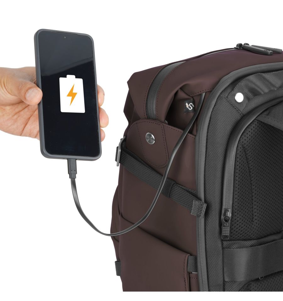 Para los creadores de contenido actuales, incluye compartimentos acolchados específicos para un portátil de hasta 16 pulgadas y una tablet de 13 pulgadas. Su funcionalidad se potencia con un pasacables lateral para baterías externas (powerbank), bolsillos ocultos para rastreadores GPS como AirTag y un arnés ergonómico con correa de pecho ajustable para mayor comodidad en jornadas prolongadas.