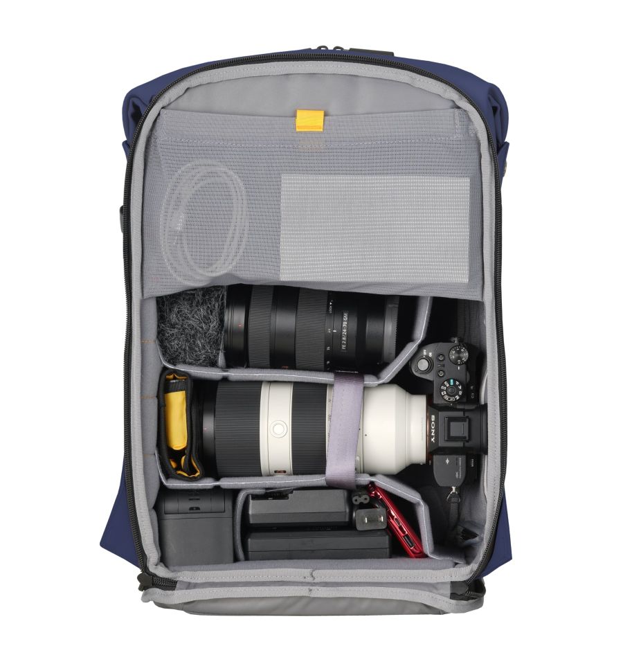 La organización interior está optimizada para el profesional moderno. El compartimento principal, con acceso trasero de seguridad, permite albergar una cámara Mirrorless o DSLR junto con 3-4 objetivos, un flash o un dron tipo DJI Mavic con todos sus accesorios. Además, el compartimento superior tipo daypack es perfecto para tus pertenencias personales o material adicional.