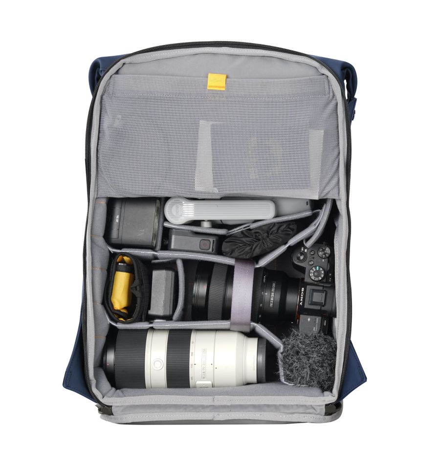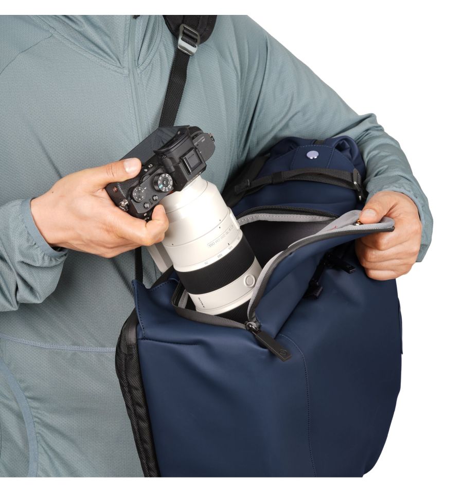 El confort está garantizado gracias a su arnés ergonómico con correa de pecho ajustable, que distribuye el peso de sus 1,84 kg de manera eficiente. También incluye bolsillos laterales para trípode o botella, y un bolsillo flexible en la hombrera para el smartphone.