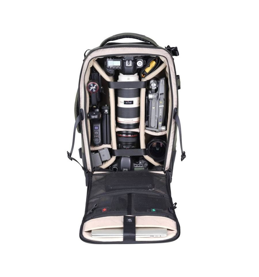 En el interior de esta "pequeña maleta" bien acolchada se encuentra un espacioso compartimento interno con multitud de versátiles divisores que pueden ajustarse para llevar 2-3 DSLR con objetivos acoplados, 2-4 objetivos adicionales (hasta 400mm f/2.8), 2 unidades de flash, accesorios (tarjetas de memoria, cables, batería, cargador), un portátil de 16" y una tableta de 9,7", un trípode, un teléfono, una cartera y un pasaporte.