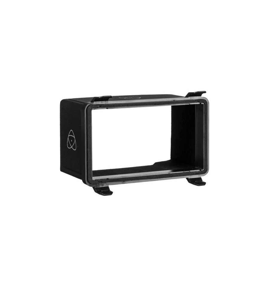 El Atomos Sunhood para Ninja V, Shinobi y Shinobi SDI , en negro, presenta un diseño a presión que permite colocarlo/quitarlo fácilmente. Se asegura rápidamente usando dos clips en la parte inferior y dos en la parte superior.