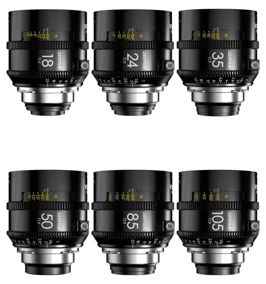 Accede a una gama de distancias focales para tus capturas cinematográficas en formato completo con el kit de 6 objetivos fijos Vespid2 T1.9 de DZOFilm. Este kit incluye objetivos de 18, 24, 35, 50, 85 y 105 mm con montura PL, que ofrecen una calidad de imagen óptima, aberraciones mínimas, tecnología Cooke /i y un diseño compacto y ligero uniforme en toda la serie.